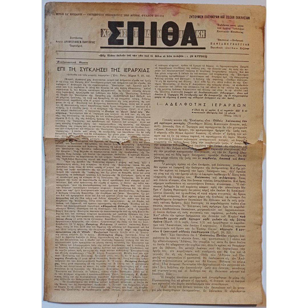 Εφημερίδα “ΧΡΙΣΤΙΑΝΙΚΗ ΣΠΙΘΑ”, Αριθ. Φ. 209-210, Οκτ.-Νοέμ. 1958