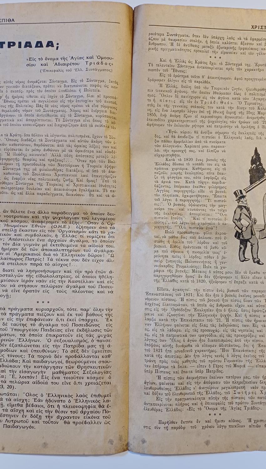 Το κύριο άρθρο φέρει τον τίτλο «Άγαλμα – Σύμβολον Παιδείας», και αποτελεί μια δριμεία κριτική του Μητροπολίτη Φλωρίνης Αυγουστίνου Καντιώτη κατά της τοποθέτησης ενός αγάλματος του θεού Ποσειδώνα στην είσοδο του τότε Υπουργείου Εθνικής Παιδείας και Θρησκευμάτων. Το άρθρο τονίζει ότι ο Χριστιανισμός ήρθε για να απελευθερώσει τον κόσμο από τη «δεισιδαιμονία» και την «ειδωλολατρία». Κατηγορεί τους υπεύθυνους του Υπουργείου ότι, αντί να προάγουν τα χριστιανικά ιδεώδη, επιστρέφουν σε «σκοτεινές» εποχές.