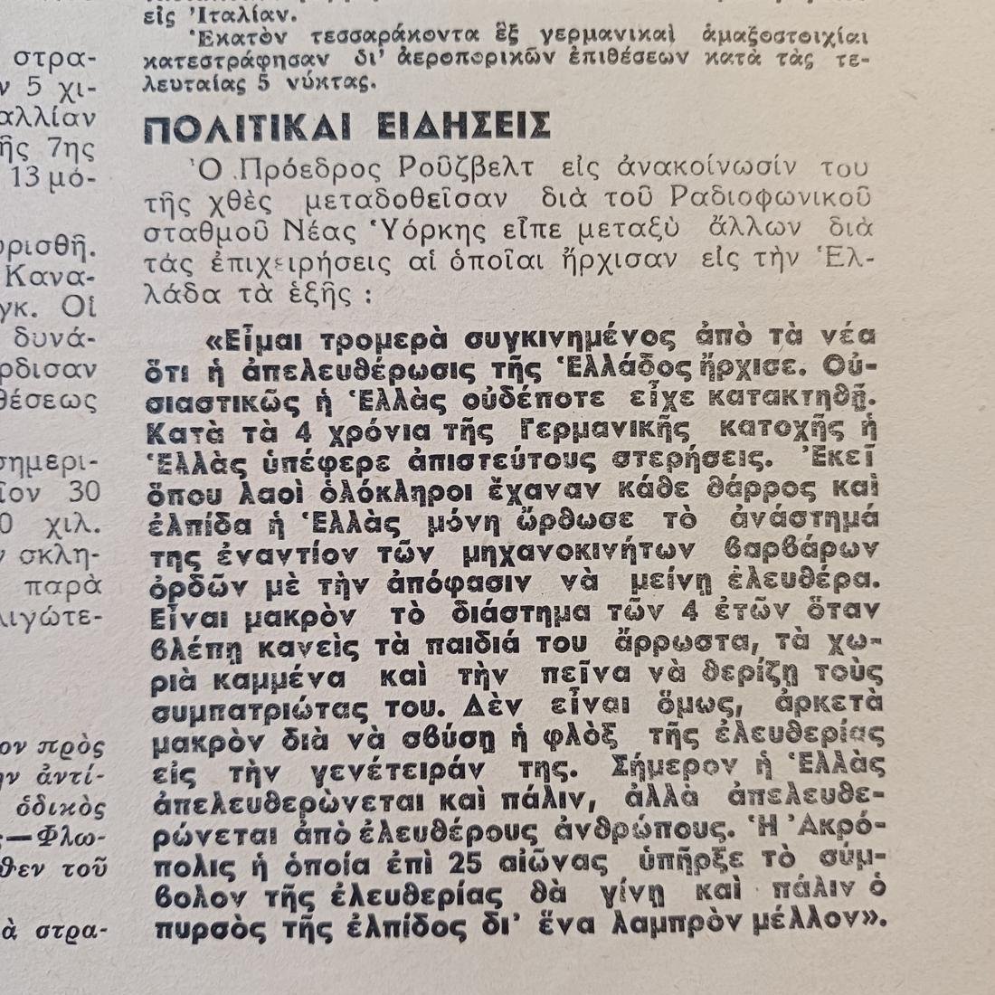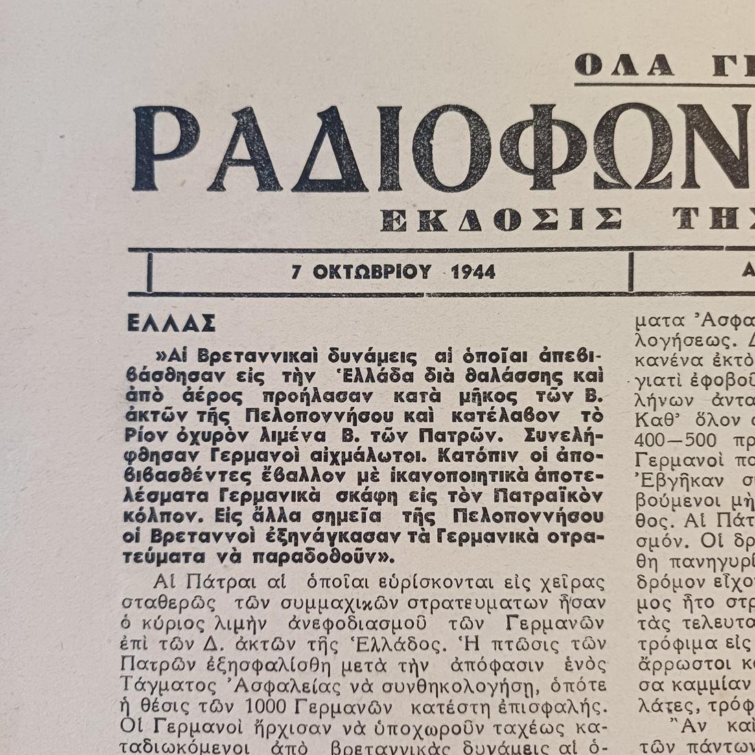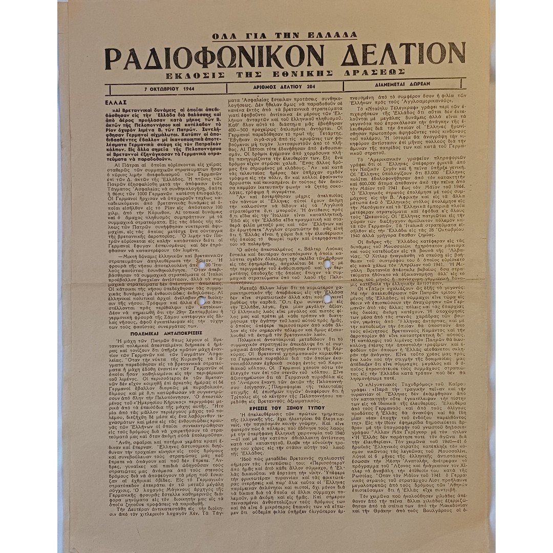 Η εφημερίδα “Ραδιοφωνικόν δελτίον- Έκδοσις της Εθνικής Δράσεως” εκδόθηκε από τον Πανελλήνιο Απελευθερωτικό Συνασπισμό (ΠΑΣ) με ημερομηνία 7 Οκτωβρίου 1944 και αριθμό δελτίου 204. Περιλαμβάνει την ενημέρωση στον ελληνικό λαό για τα επιτυχημένα στρατιωτικά γεγονότα της απελευθέρωσης. Συγκεκριμένα, περιγράφει πώς οι βρετανικές δυνάμεις αποβιβάστηκαν στην Ελλάδα, προέλασαν στην Πελοπόννησο και κατέλαβαν το Ρίον και την Πάτρα. Τονίζει ότι η Πάτρα ήταν σημαντικό λιμάνι ανεφοδιασμού των Γερμανών, οι οποίοι υποχώρησαν ταχέως, ενώ μεγάλο μέρος των γερμανικών δυνάμεων παραδόθηκε. Επίσης περιλαμβάνει μια δήλωση του Προέδρου των ΗΠΑ Φράνκλιν Ρούζβελτ, η οποία μεταδόθηκε από ραδιοφωνικό σταθμό της Νέας Υόρκης. Στη δήλωσή του, ο Ρούζβελτ εκφράζει τη χαρά και τη συγκίνησή του για την έναρξη της απελευθέρωσης της Ελλάδας. Επαινεί τον ελληνικό λαό για το θάρρος και την αντίστασή του κατά τα τέσσερα χρόνια της γερμανικής κατοχής, τονίζοντας ότι η Ελλάδα “ουδέποτε είχε κατακτηθή”, παρά τις στερήσεις και την πείνα. Αναφέρει ότι η Ακρόπολη, σύμβολο ελευθερίας, θα ξαναγίνει “πυρσός ελπίδος” για ένα λαμπρό μέλλον.