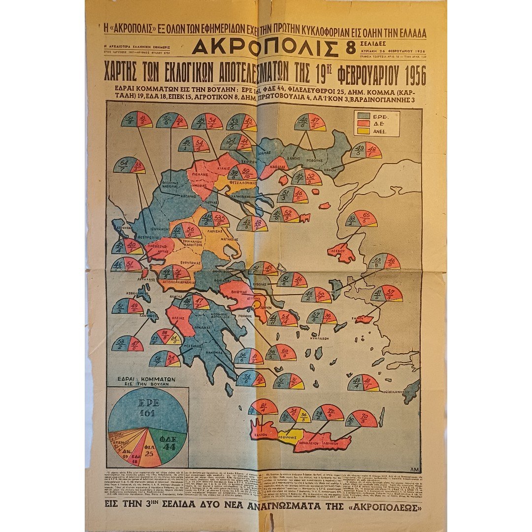 Η εφημερίδα “ΑΚΡΟΠΟΛΙΣ” περιέχει τις ελληνικές βουλευτικές εκλογές του 1956. Το πρωτοσέλιδο εκδόθηκε την Κυριακή 26 Φεβρουαρίου 1956 με αριθμό φύλλου 8759, μία εβδομάδα μετά τις εκλογές της 19ης Φεβρουαρίου. Εστίασε στον απόηχο των βουλευτικών εκλογών, αναλύοντας την επικράτηση του Κωνσταντίνου Καραμανλή και της ΕΡΕ καθώς και στην ιστορική πρώτη συμμετοχή των γυναικών στις κάλπες.