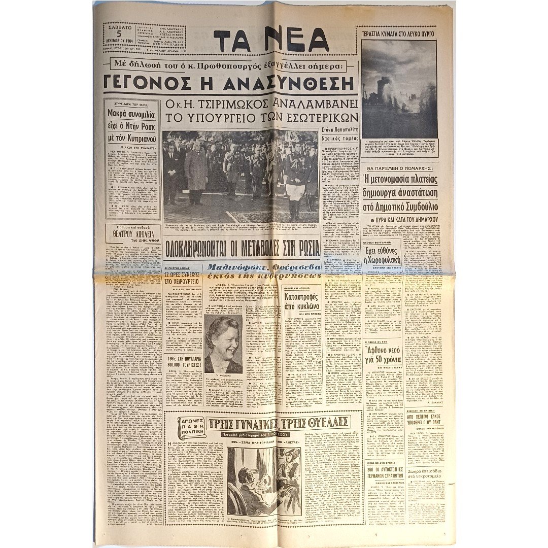Η 12/σέλιδη εφημερίδα “ΤΑ ΝΕΑ” έτος 20ον, αριθμό 5971 της 5ης Δεκεμβρίου 1964 περιλαμβάνει μια σειρά από σημαντικά εγχώρια και διεθνή θέματα, με κεντρική είδηση την ανακοίνωση του Πρωθυπουργού, Γεωργίου Παπανδρέου, για την κυβερνητική ανασύνθεση και την ανάληψη του Υπουργείου Εσωτερικών από τον Ηλία Τσιριμώκο. Επίσης αναφέρεται ο εορτασμός της Αγίας Βαρβάρας στη Σχολή Πυροβολικού, παρουσία του Βασιλέως, του πρίγκιπα Μιχαήλ και άλλων αξιωματούχων, ενώ υπάρχει και σύντομη αναφορά σε εξελίξεις στη Ρωσία, όπως η απομάκρυνση των Μαλινόφσκυ και Φούρτσεβα από την κυβέρνηση.