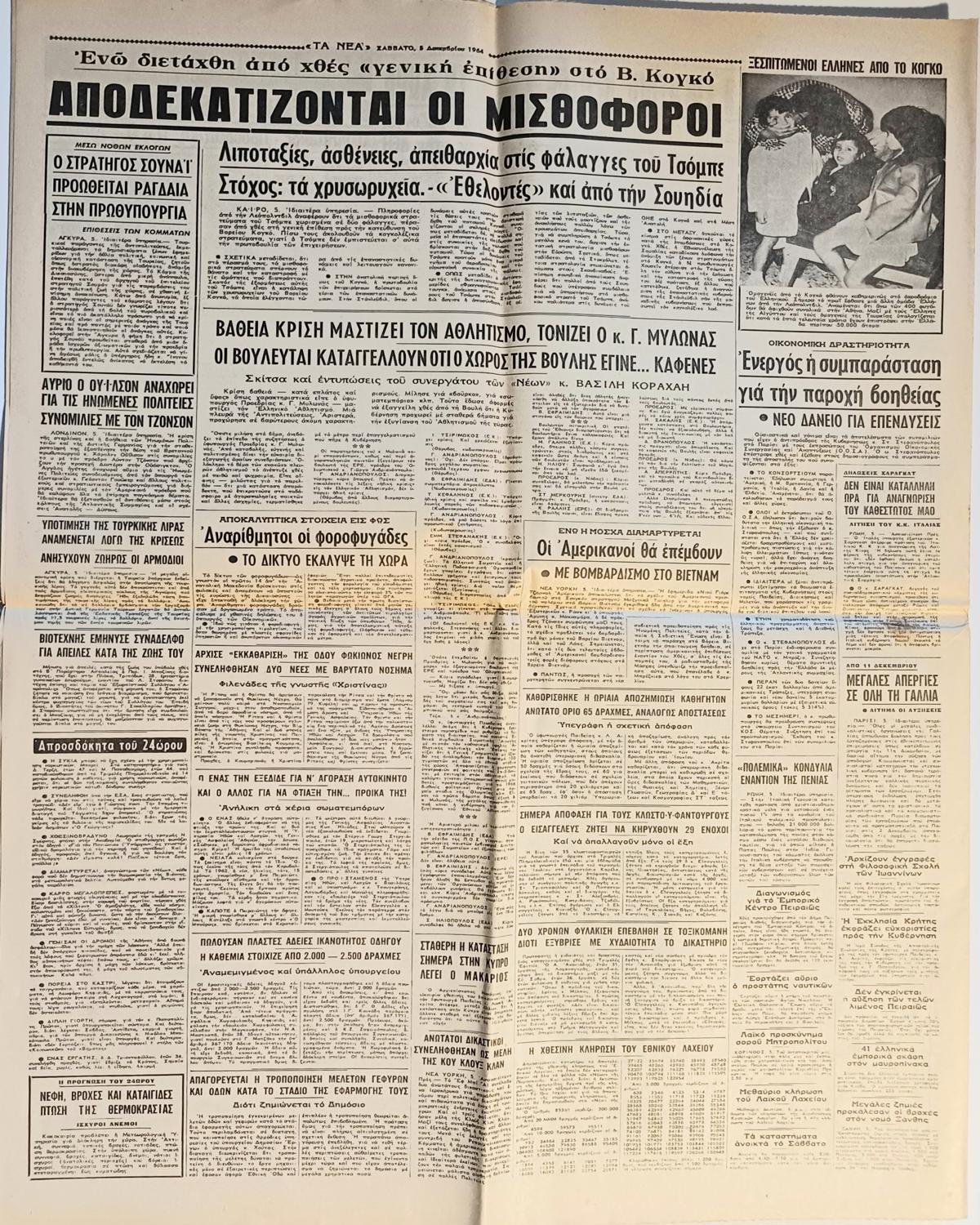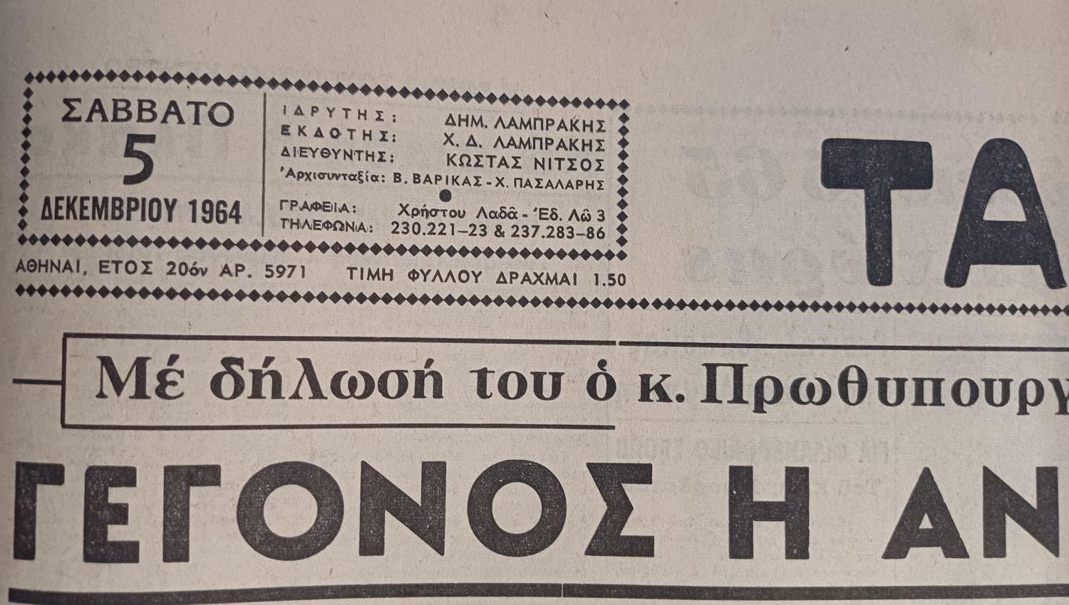 Εφημερίδα “ΤΑ ΝΕΑ” Έτος 20ον, Αριθ. 5971, 5/12/1964