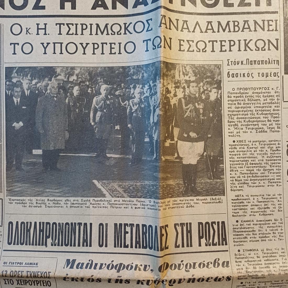 12/σέλιδη εφημερίδα “ΤΑ ΝΕΑ” έτος 20ον, αριθμό 5971 της 5ης Δεκεμβρίου 1964. Περιλαμβάνει ανακοίνωση του Πρωθυπουργού για την κυβερνητική ανασύνθεση και την ανάληψη του Υπουργείου Εσωτερικών από τον Ηλία Τσιριμώκο, τον εορτασμό της Αγίας Βαρβάρας στη Σχολή Πυροβολικού, παρουσία του Βασιλέως, του πρίγκιπα Μιχαήλ και άλλων αξιωματούχων και άλλα.