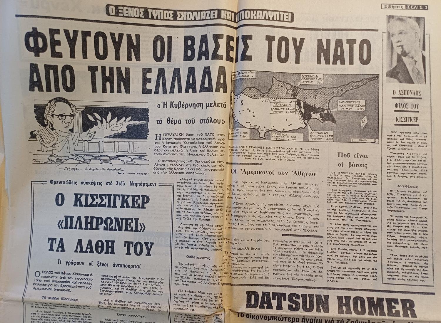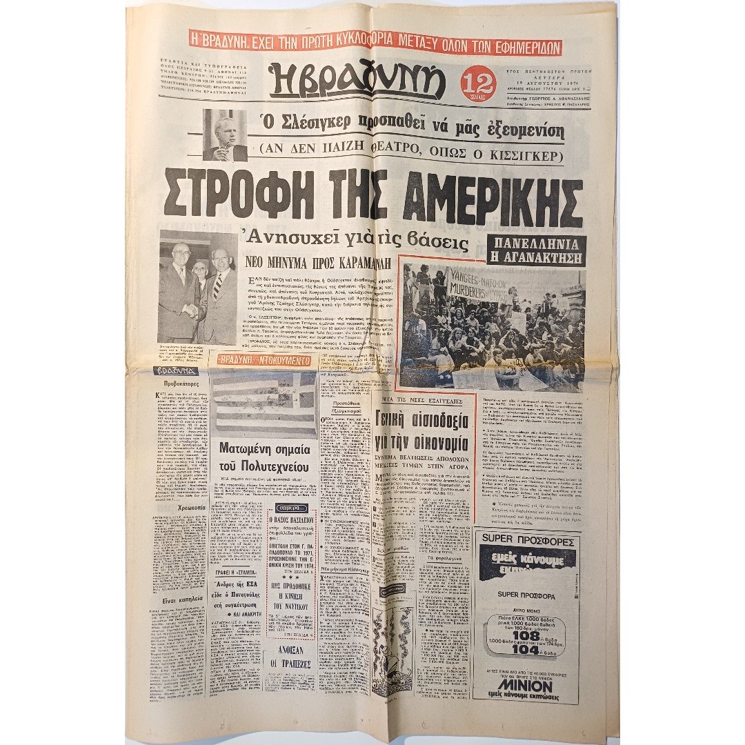 Το κύριο άρθρο τιτλοφορείται “Στροφή της Αμερικής”, με αναφορές σε ανησυχίες για τις βάσεις, το νέο μήνυμα προς Καραμανλή, και την πανελλήνια αγανάκτηση. Υπήρχαν άλλα θέματα που κάλυπταν τις προσπάθειες του Σλέσιγκερ να κατευνάσει την Ελλάδα, τη ματωμένη σημαία του Πολυτεχνείου, προβοκάτορες, γενική αισιοδοξία για την οικονομία και το άνοιγμα των τραπεζών.