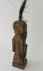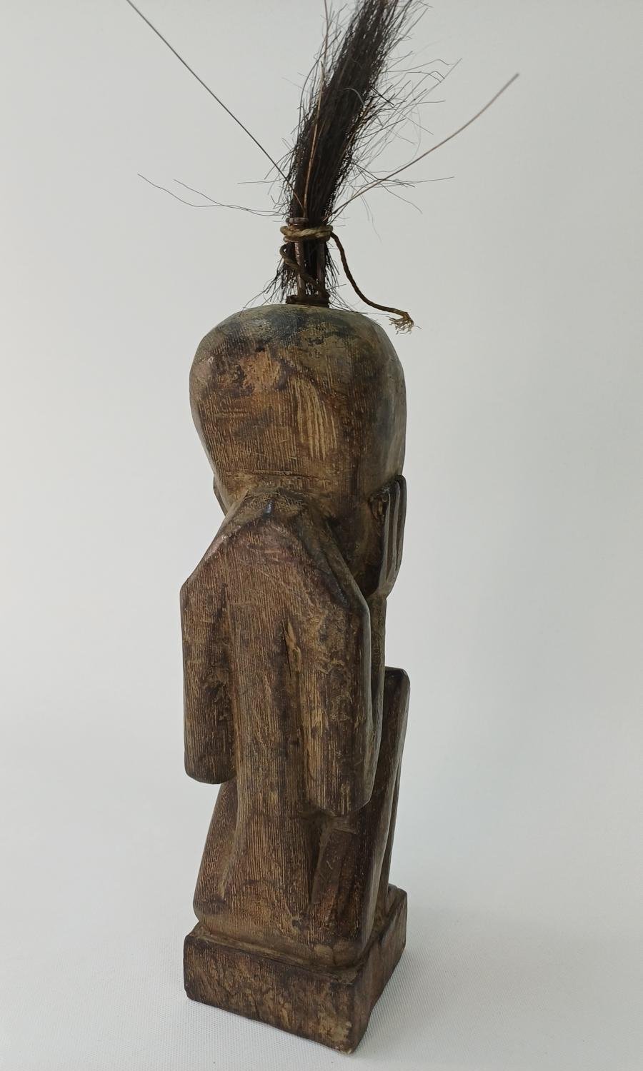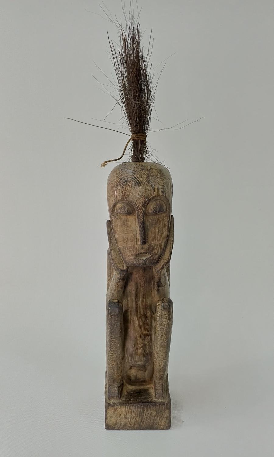 Καθιστή σκεπτόμενη φιγούρα Αφρικανικής προέλευσης, σκαλιστή από μασίφ ξύλο. Έχει ύψος 30 cm και η βάση της είναι 7 * 7 cm. Στο κεφάλι έχει φυσικές ίνες (με φθορές λόγω παλαιότητας). Τέτοιου είδους γλυπτά συχνά έχουν θρησκευτική ή πολιτιστική σημασία. καθώς επίσης και διακοσμητική, για να φέρνουν καλή τύχη ή προστασία.