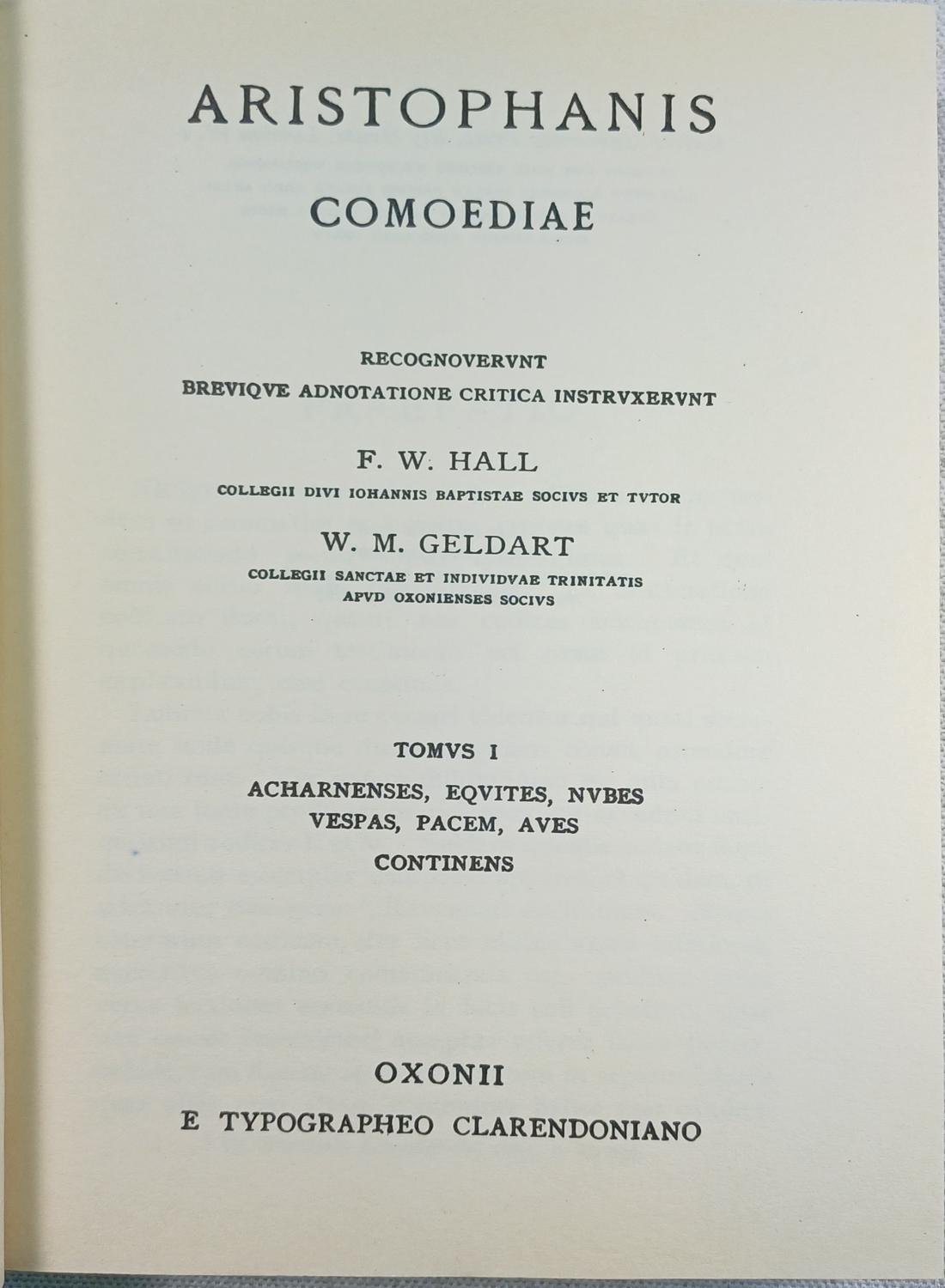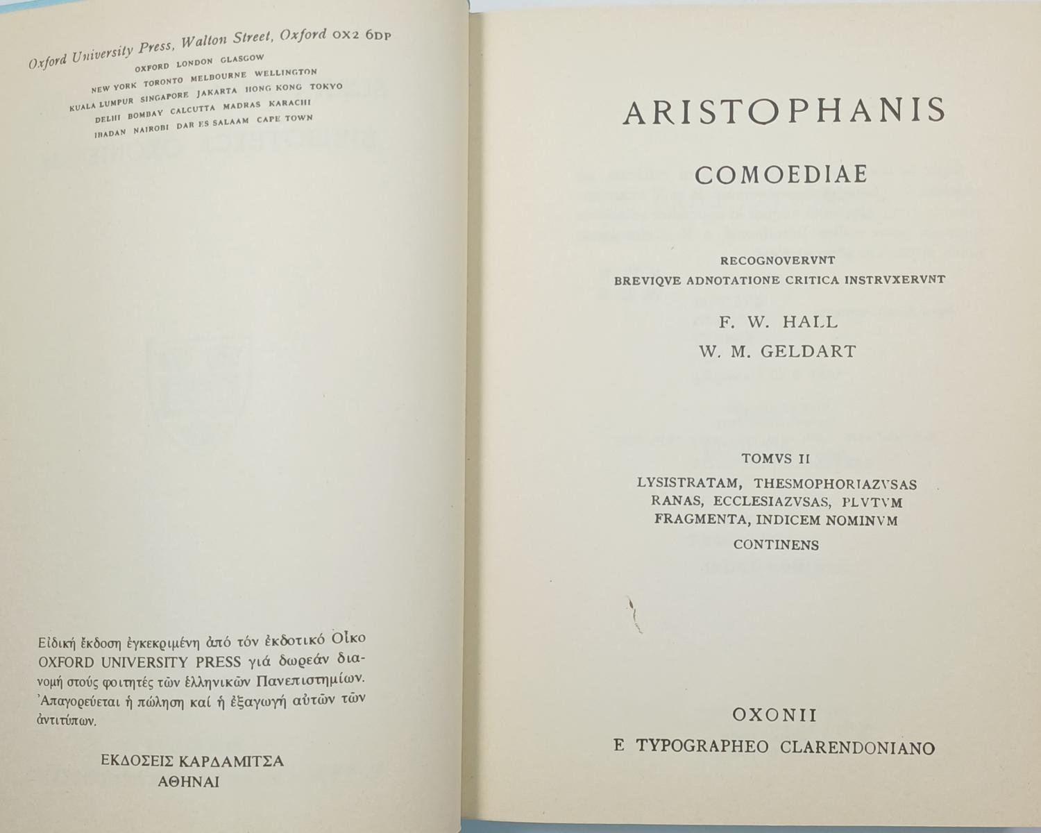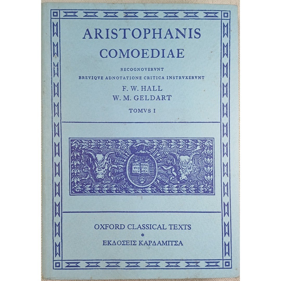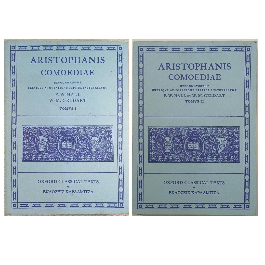 Οι δύο τόμοι του “Aristophanis Comoediae” από τις εκδόσεις Oxford Classical Texts και Καρδαμίτσα, περιέχουν το σύνολο των έντεκα σωζόμενων κωμωδιών του Αριστοφάνη στην αρχαία ελληνική γλώσσα, με λατινικά προλεγόμενα και κριτικό υπόμνημα. Πιο συγκεκριμένα, ο πρώτος τόμος περιλαμβάνει τις κωμωδίες Αχαρνής, Ιππής, Νεφέλες, Σφήκες, Ειρήνη και Όρνιθες, ενώ ο δεύτερος τόμος περιλαμβάνει τις Λυσιστράτη, Θεσμοφοριάζουσες, Βάτραχοι, Εκκλησιάζουσες και τον Πλούτο, μαζί με σωζόμενα αποσπάσματα άλλων έργων και ευρετήριο ονομάτων.