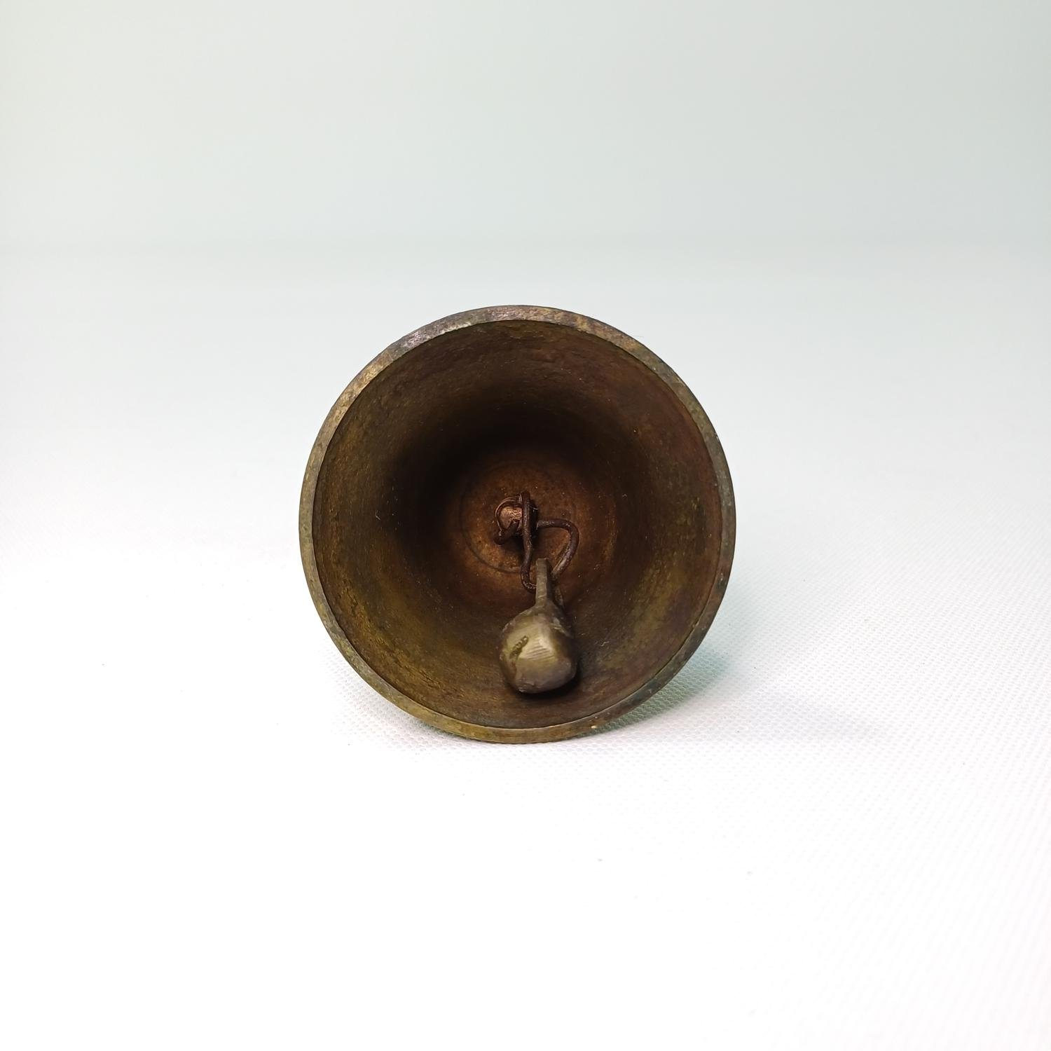 Μπρούτζινη καμπανούλα με διακοσμητικό λάμα στην κορυφή, ύψους 10 cm και διαμέτρου 5,5 cm. Υπάρχει οξείδωση στο μέταλλο λόγω παλαιότητας.