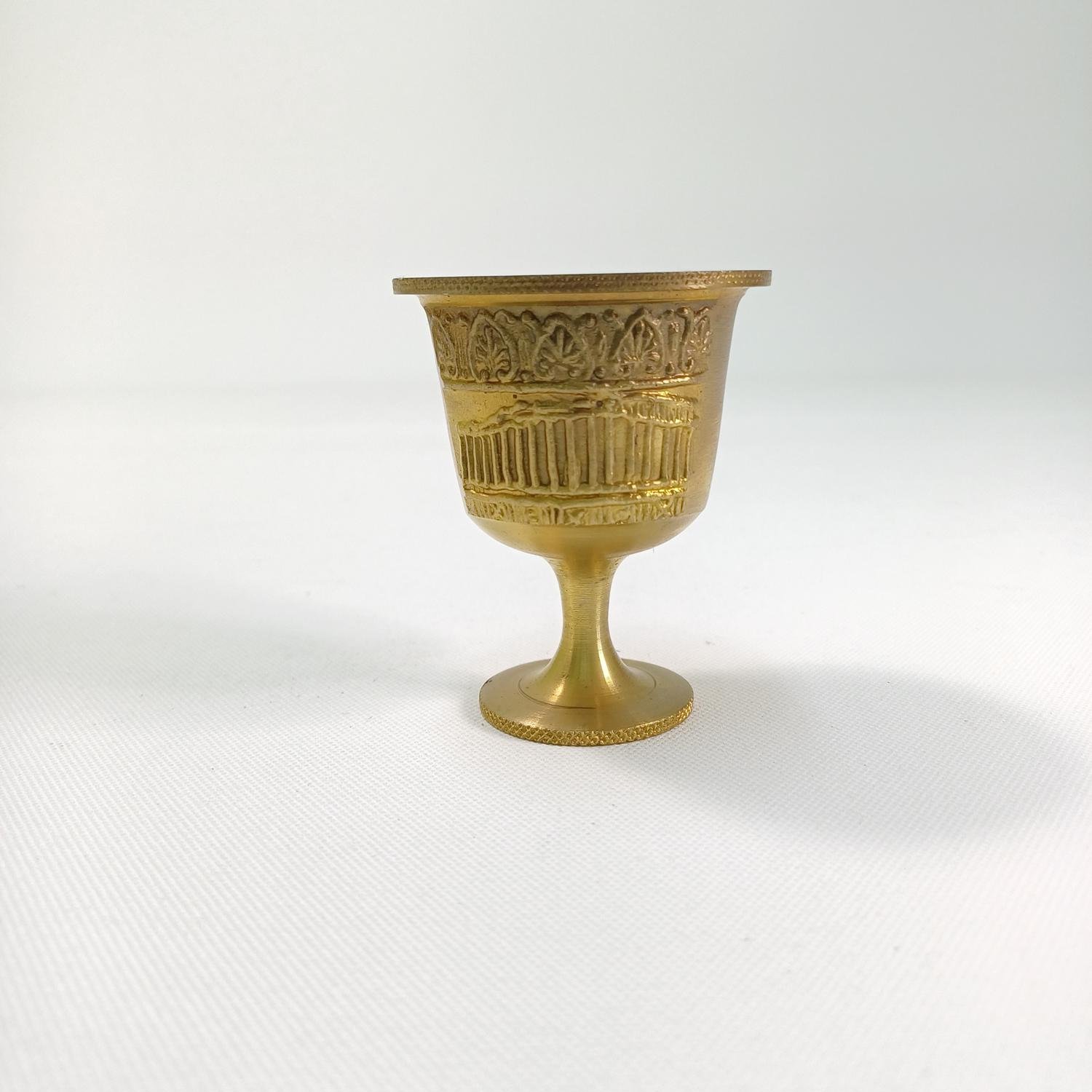 Μπρούτζινο διακοσμητικό γουδί με ανάγλυφο Παρθενώνα και αρχαία ελληνικά σχέδια περιμετρικά. Έχει ύψος 7 cm και διάμετρο 5,5 cm και το γουδοχέρι έχει μήκος 8 cm. Είναι μεταχειρισμένο αλλά σε καλή κατάσταση.