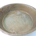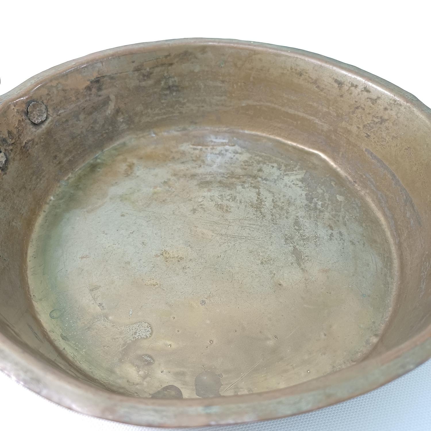 Αυτό το σκεύος είναι μεταχειρισμένο και έχει διάμετρο 20,5 cm και ύψος 5 cm. Υπάρχουν φθορές στο μέταλλο λόγω χρήσης και παλαιότητας.