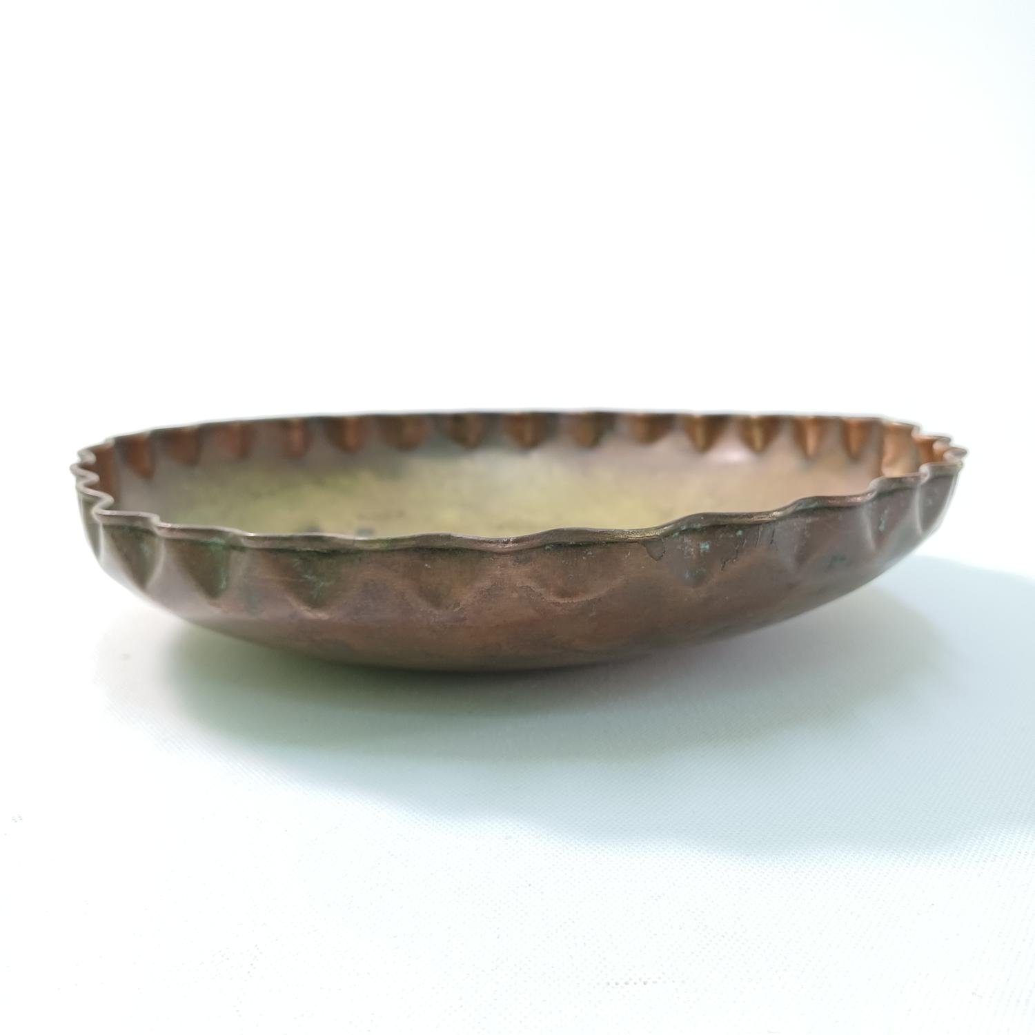 Διακοσμητικό χάλκινο σκεύος με ανάγλυφο, περίτεχνο σχήμα στο κέντρο. Έχει κυματιστό χείλος και καμπυλωτό πάτο. Η διάμετρός του είναι 23,5 cm και το ύψος του είναι 5 cm, είναι μεταχειρισμένο, προηγούμενων δεκαετιών, και υπάρχουν φθορές στο μέταλλο λόγω παλαιότητας. Επίσης υπάρχουν κάποια βαθουλώματα που προέρχονται πιθανών από χτυπήματα του σκεύους ή κακή χρήση προηγούμενου ιδιοκτήτη.