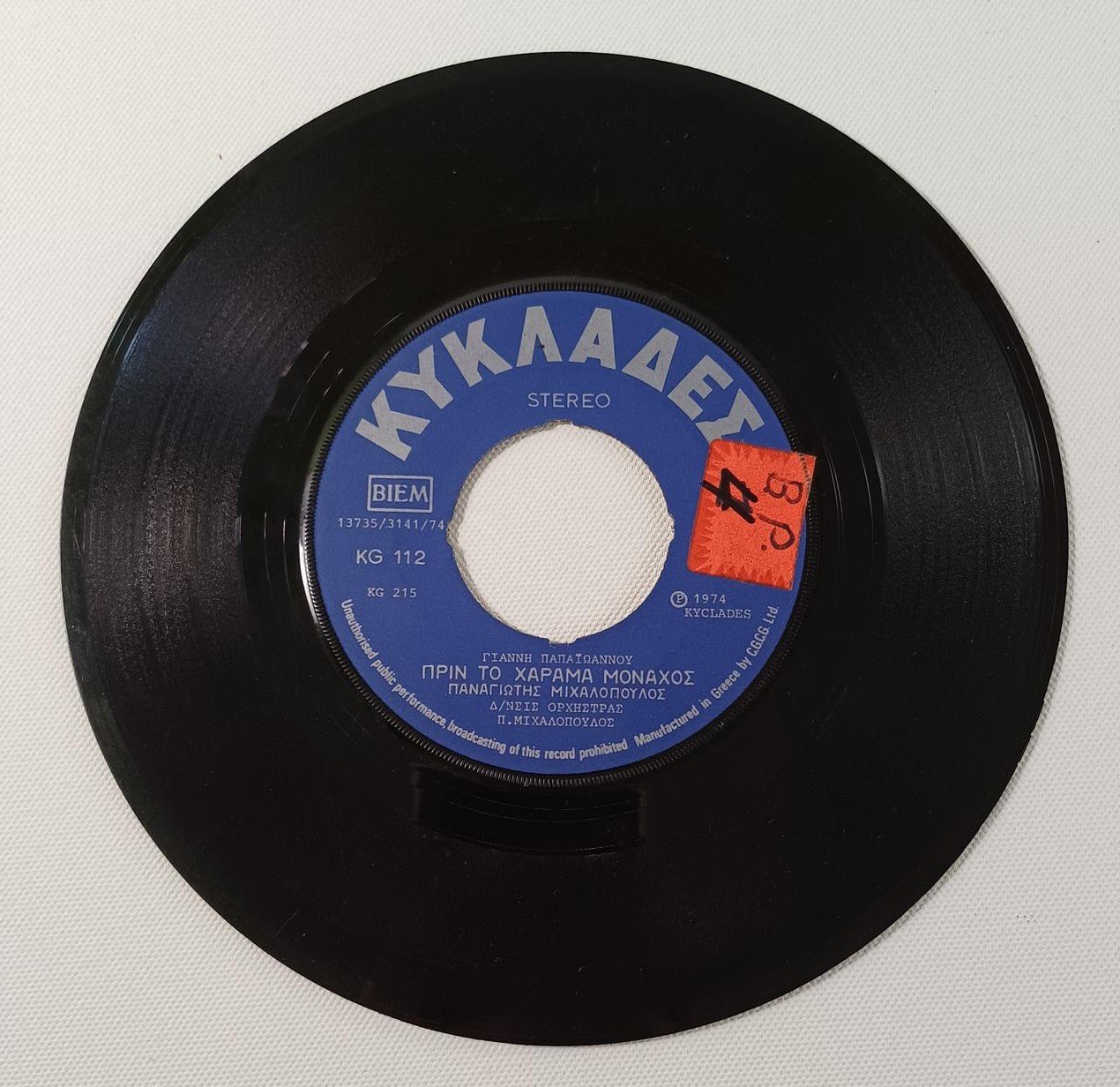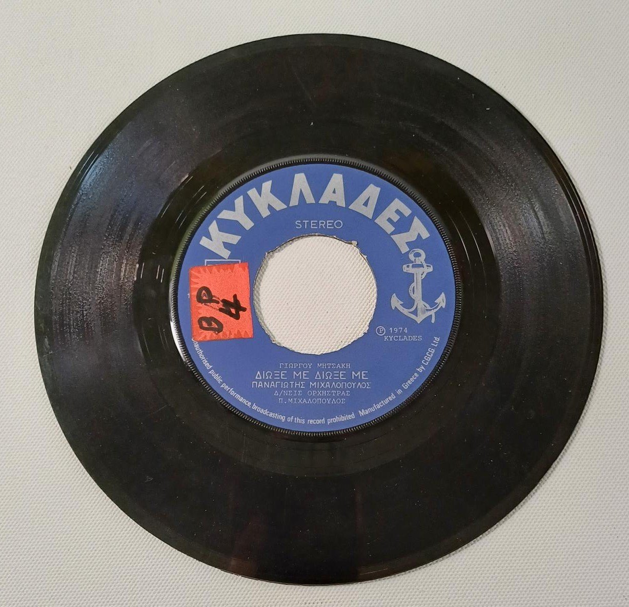 Vintage δίσκος βινυλίου 45 στροφών σε παραγωγή της εταιρείας ‘ΚΥΚΛΑΔΕΣ (Λεονάρδος Μπουρνέλης)‘
