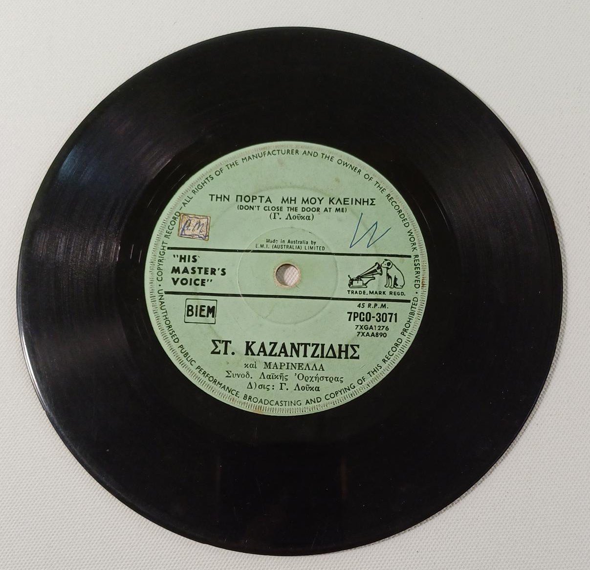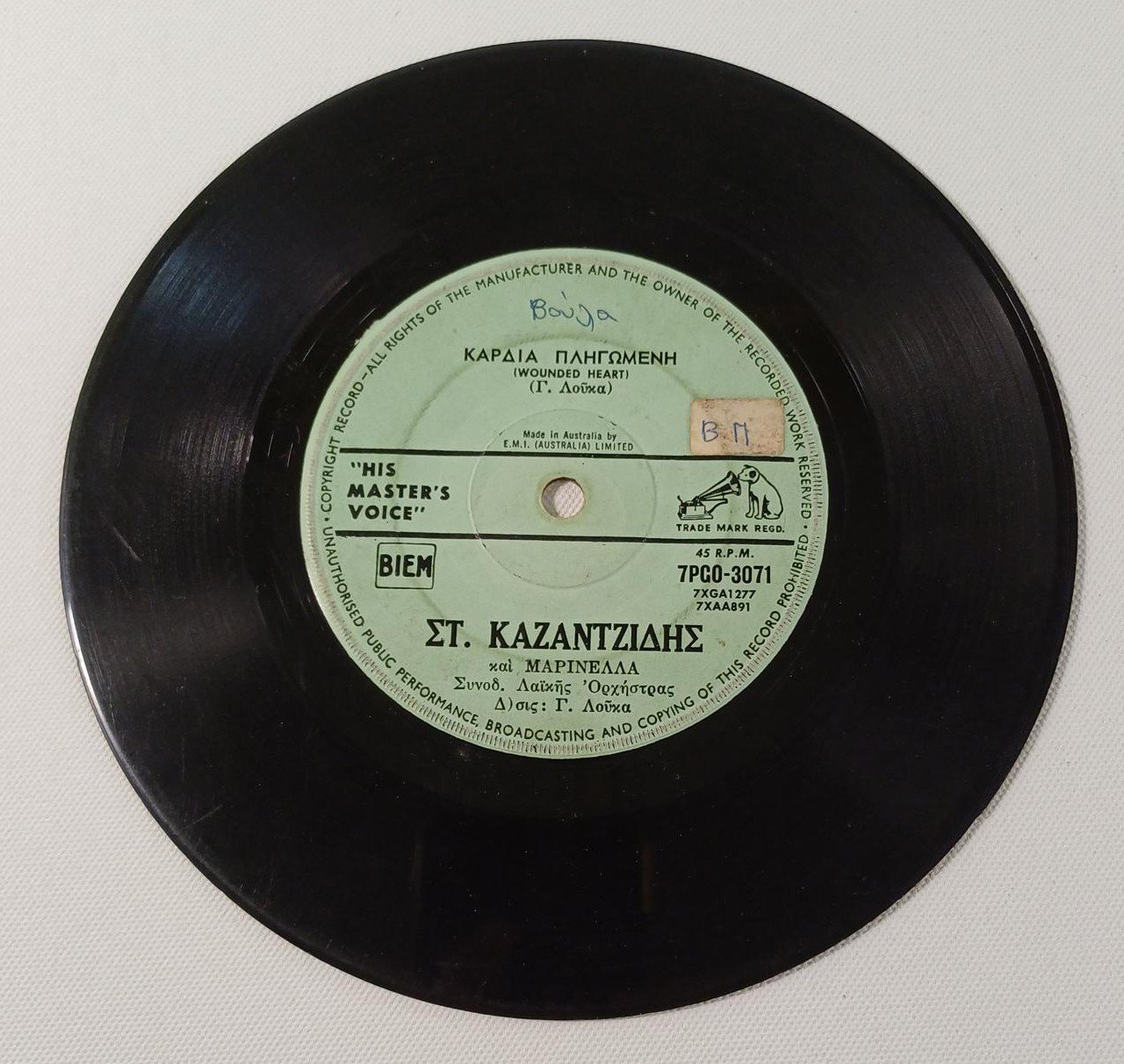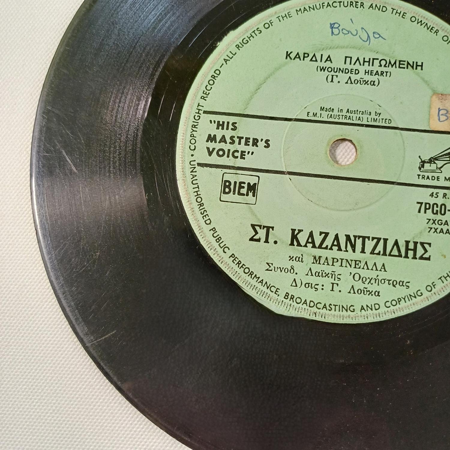 Vintage δίσκος βινυλίου 45 στροφών σε παραγωγή της εταιρείας ‘His master’s voice’