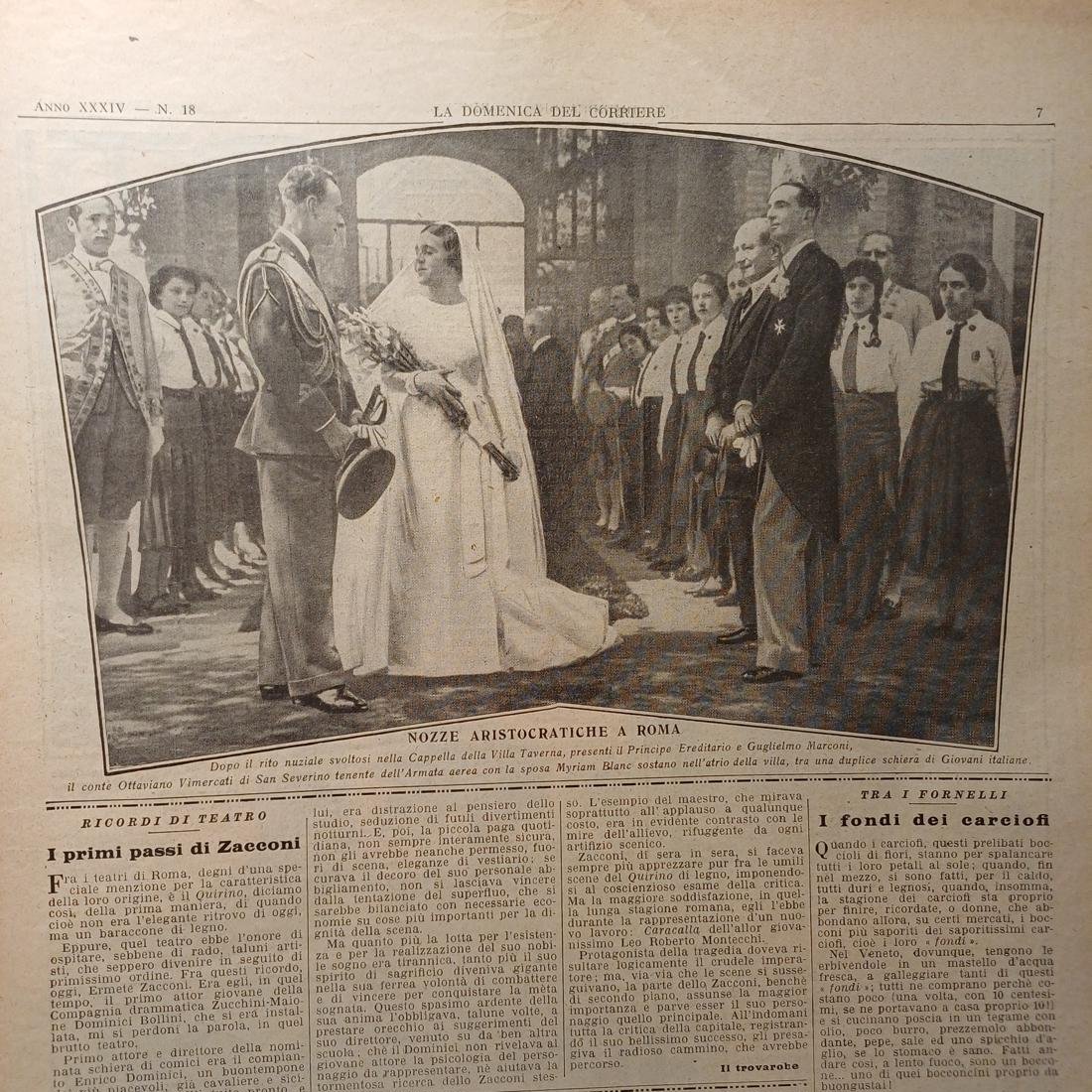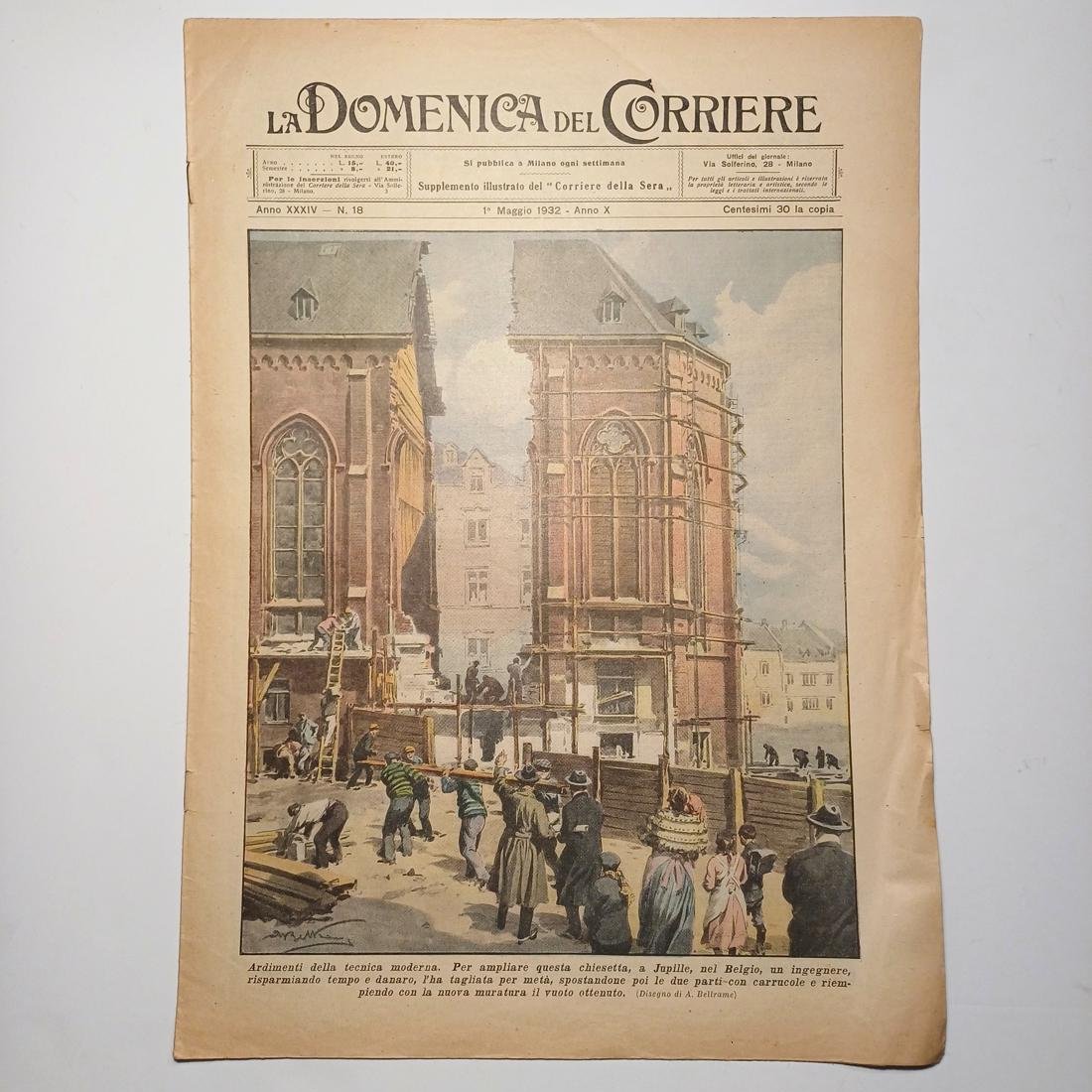 Η σπάνια 8/φυλλη εβδομαδιαία εφημερίδα “La Domenica del Corriere”, κυκλοφόρησε στις 1 Μαΐου 1932-X, έτος ΧXXIV, αριθμός 18, στο Μιλάνο. Το λιθόγραφο εξώφυλλο, εικονογραφημένο από τον Achille Beltrame, απεικονίζει τη διαδικασία κατά την οποία, για να επεκταθεί μια εκκλησία στο Ζουπίγ (Jupille) του Βελγίου, ένας μηχανικός τη χώρισε στη μέση, μετακίνησε τα δύο τμήματα με τροχαλίες και γέμισε το κενό με νέα τοιχοποιία. Επίσης ένα από τα άρθρα με τίτλο «Αριστοκρατικός γάμος στη Ρώμη» καταγράφει τη γαμήλια τελετή του κόμη Ottaviano Vimercati di San Severino, υπολοχαγού της αεροπορίας, και της Myriam Blanc. Η τελετή έλαβε χώρα στο παρεκκλήσι της Villa Taverna, παρουσία του Διαδόχου Πρίγκιπα και του Guglielmo Marconi, του βραβευμένου με Νόμπελ εφευρέτη του ραδιοφώνου. Το άρθρο περιλαμβάνει επίσης μία ενότητα αφιερωμένη στον διάσημο Ιταλό ηθοποιό Ermete Zacconi και τις πρώτες του εμφανίσεις στο Teatro Quirino της Ρώμης.