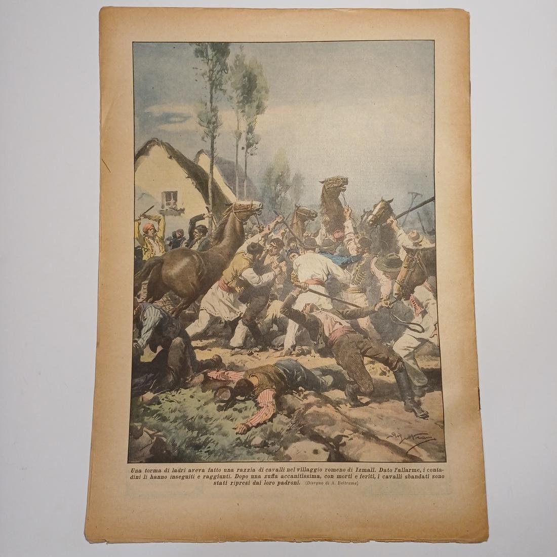 Η σπάνια 8/φυλλη εβδομαδιαία εφημερίδα “La Domenica del Corriere”, κυκλοφόρησε στις 6 Σεπτεμβρίου 1931-IX, έτος XXXIII, αριθμός 36, στο Μιλάνο. Το λιθόγραφο εξώφυλλο είναι έργο του Achille Beltrame και απεικονίζει μια σκηνή βασισμένη σε μια αναφερόμενη είδηση της εποχής: Ένας μουεζίνης δέχεται επίθεση από έναν πεινασμένο λύκο στην κορυφή ενός μιναρέ κοντά στο Ζαγαζίκ (Zagazig) της Κάτω Αιγύπτου, ενώ καλούσε τους πιστούς στην πρωινή προσευχή. Ο λύκος είχε παγιδευτεί μέσα στο τζαμί όλη τη νύχτα, ανέβηκε στον μιναρέ και, στις κραυγές του μουεζίνη, έσπευσαν πιστοί με ρόπαλα και τον βρήκαν να παλεύει με το ζώο που τον είχε δαγκώσει άγρια. Ένα από τα άρθρα φέρει μια ιστορία μυστηρίου με τίτλο “La busta inattesa” (“Ο απροσδόκητος φάκελος”) που αναφέρει έναν άνδρα που αναγνωρίζει έναν παλιό του αντίπαλο, μια περιγραφή των άθλιων συνθηκών διαβίωσης σε υπόγειες κατοικίες, και ένα κοινωνικό άρθρο γνώμης με τίτλο “Briscola e disoccupazione” (“Μπρίσκολα και ανεργία”) που σχολιάζει τους ανέργους του Βερολίνου που περνούν την ώρα τους παίζοντας χαρτιά σε δημόσια πάρκα αντί να εργάζονται.