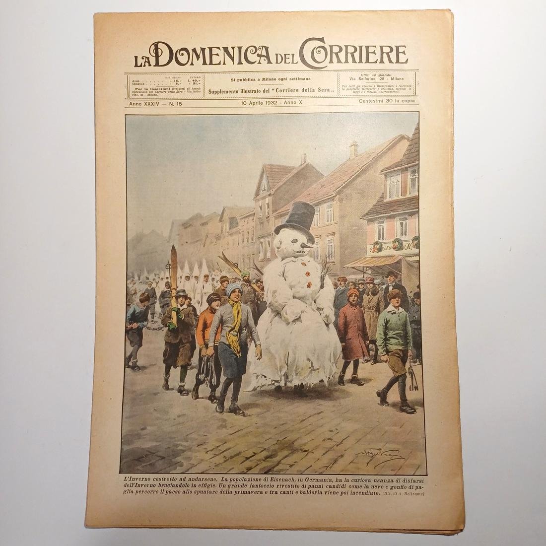Η σπάνια 8/φυλλη εβδομαδιαία εφημερίδα “La Domenica del Corriere”, κυκλοφόρησε στις 10 Απριλίου 1932-X, έτος XXXIV, αριθμό2 15, στο Μιλάνο. Το λιθόγραφο εξώφυλλο είναι έργο του Achille Beltrame που τιτλοφορείται “L’Inverno costretto ad andarsene” (Ο Χειμώνας αναγκάζεται να φύγει), απεικονίζει ένα έθιμο στην πόλη Άιζεναχ (Eisenach) της Γερμανίας, όπου οι κάτοικοι υποδέχονται την άνοιξη καίγοντας ένα μεγάλο ομοίωμα χιονάνθρωπου γεμάτο άχυρα, μια πράξη που συμβολίζει το διώξιμο του χειμώνα. Επίσης ένα από τα άρθρα με τίτλο «Ο αθλητισμός μεταξύ των Άγγλων φοιτητών» αναφέρει ότι οι φοιτητές ασχολούνται με τον αθλητισμό και παρουσιάζει μια φωτογραφία από έναν αγώνα δρόμου ενός τετάρτου του μιλίου στο Westminster. Ένα άλλο άρθρο, «Πώς ταξιδεύουν στις Φιλιππίνες», περιγράφει τις παραδοσιακές αιώρες από μπαμπού που χρησιμοποιούνται ακόμα εκεί.
