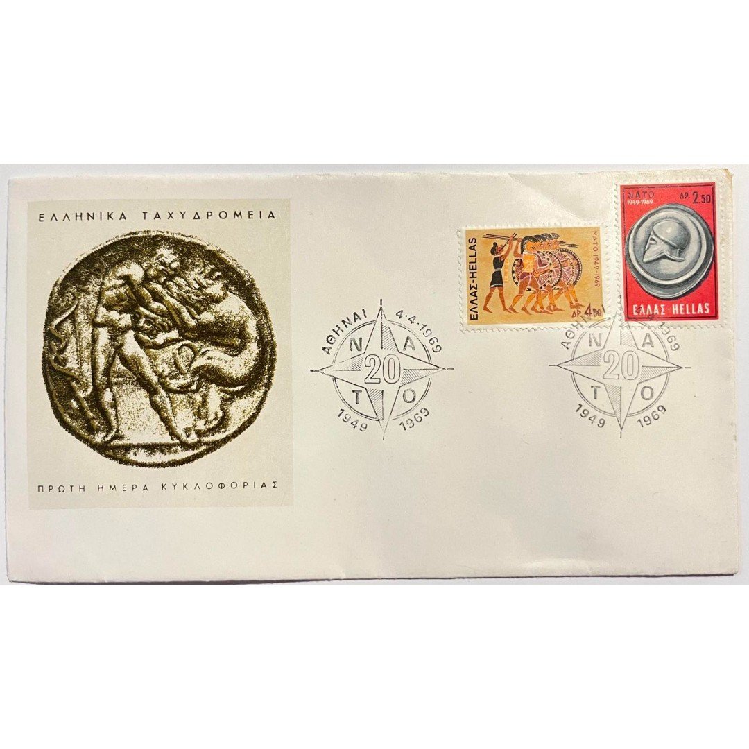 Φάκελος φιλοτελισμού Πρώτης Ημέρας Κυκλοφορίας που εκδόθηκε από τα Ελληνικά Ταχυδρομεία το 1969. Ο φάκελος περιλαμβάνει 2 γραμματόσημα αξίας 4,50 και 2,50 δραχμών αντίστοιχα με θέμα την “20η ΕΠΕΤΕΙΟ ΝΑΤΟ 1949 – 1969”. Τα γραμματόσημα απεικονίζουν αρχαίους Έλληνες πολεμιστές και μια περικεφαλαία. Η ημερομηνία σφραγίδας είναι 4-4-1969 και η τοποθεσία είναι Αθήνα.