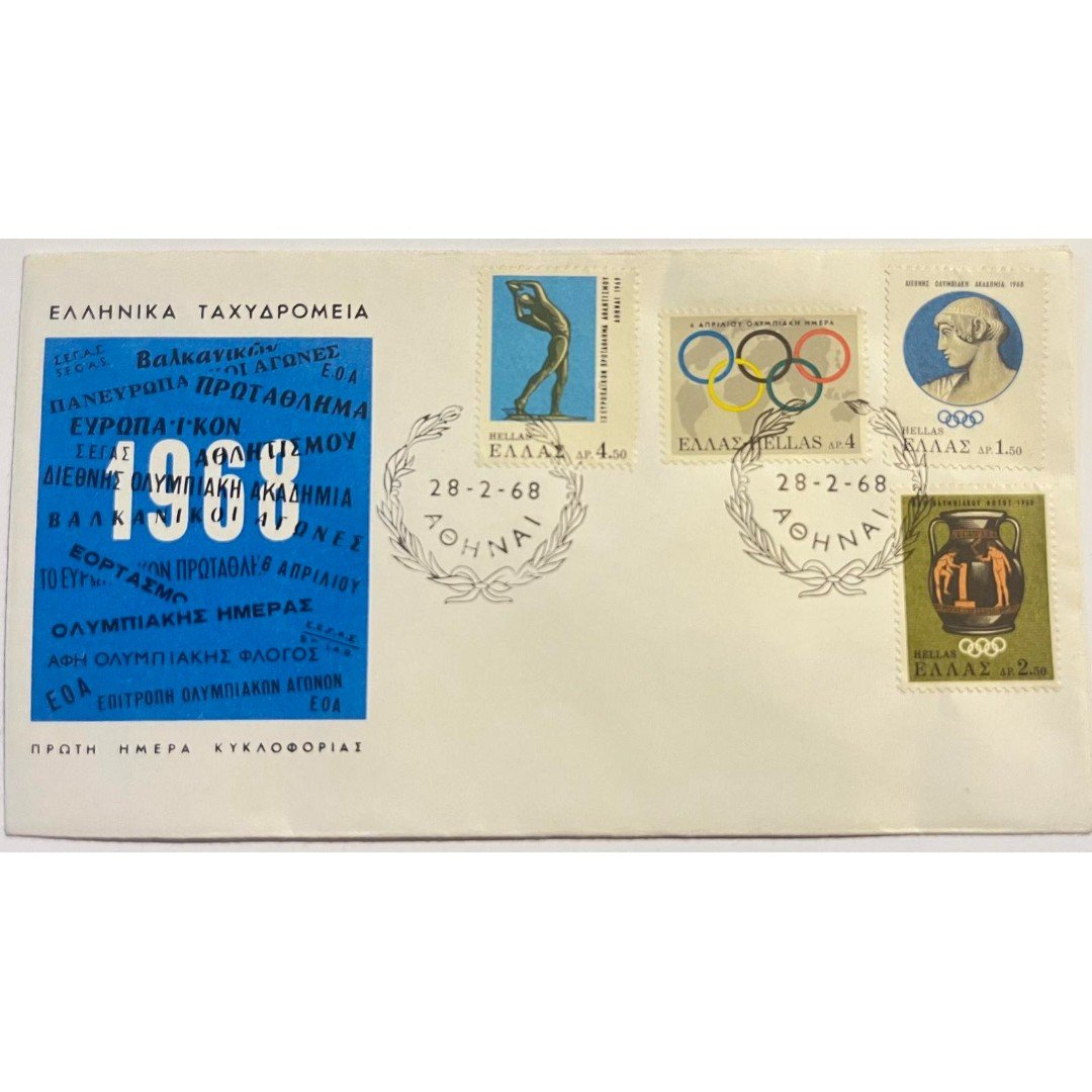 Φάκελος φιλοτελισμού Πρώτης Ημέρας Κυκλοφορίας που εκδόθηκε από τα Ελληνικά Ταχυδρομεία το 1968. Ο φάκελος περιλαμβάνει τέσσερα γραμματόσημα αξίας 4.50, 4, 1.50 και 2.50 δραχμών αντιστοίχως με θέμα “ΔΙΕΘΝΗΣ ΟΛΥΜΠΙΑΚΗ ΗΜΕΡΑ”. Τα γραμματόσημα απεικονίζουν τον Δισκοβόλο, τους ολυμπιακούς κύκλους, μια αρχαία κεφαλή και έναν αμφορέα. Η ημερομηνία σφραγίδας είναι 28-2-1968 και η τοποθεσία είναι Αθήνα.