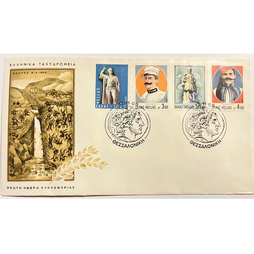Φάκελος φιλοτελισμού Πρώτης Ημέρας Κυκλοφορίας που εκδόθηκε από τα Ελληνικά Ταχυδρομεία το 1969. Ο φάκελος περιλαμβάνει 4 γραμματόσημα αξίας 2.50, 3.50, 1.50 και 4.50 δραχμών αντίστοιχα με θέμα “ΝΑΟΥΣΑ 9-4-1822”. Τα γραμματόσημα απεικονίζουν εξέχουσες προσωπικότητες της Ελλάδος όπως ο Εμμ. Παπάς, ο Παύλος Μελάς, ο Δημ. Τσάμης Καρατάσιος και ο Καπετάν Κώτας. Η ημερομηνία σφραγίδας είναι 12-11-1969 και η τοποθεσία είναι Θεσσαλονίκη.