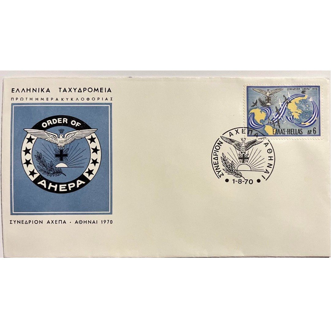 Φάκελος φιλοτελισμού Πρώτης Ημέρας Κυκλοφορίας που εκδόθηκε από τα Ελληνικά Ταχυδρομεία το 1970. Ο φάκελος περιλαμβάνει ένα γραμματόσημο αξίας έξι δραχμών με θέμα “ΣΥΝΕΔΡΙΟΝ ΑΧΕΠΑ”. Το γραμματόσημο απεικονίζει την οργάνωση βάσης Αμερικανών πολιτών ελληνικής καταγωγής. Η ημερομηνία σφραγίδας είναι 1-8-1970 και η τοποθεσία είναι Αθήνα.