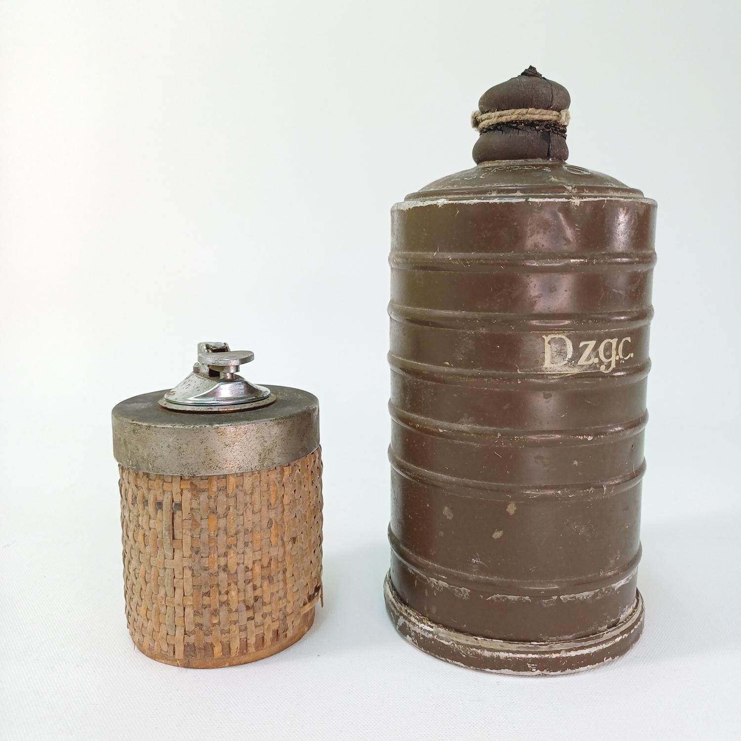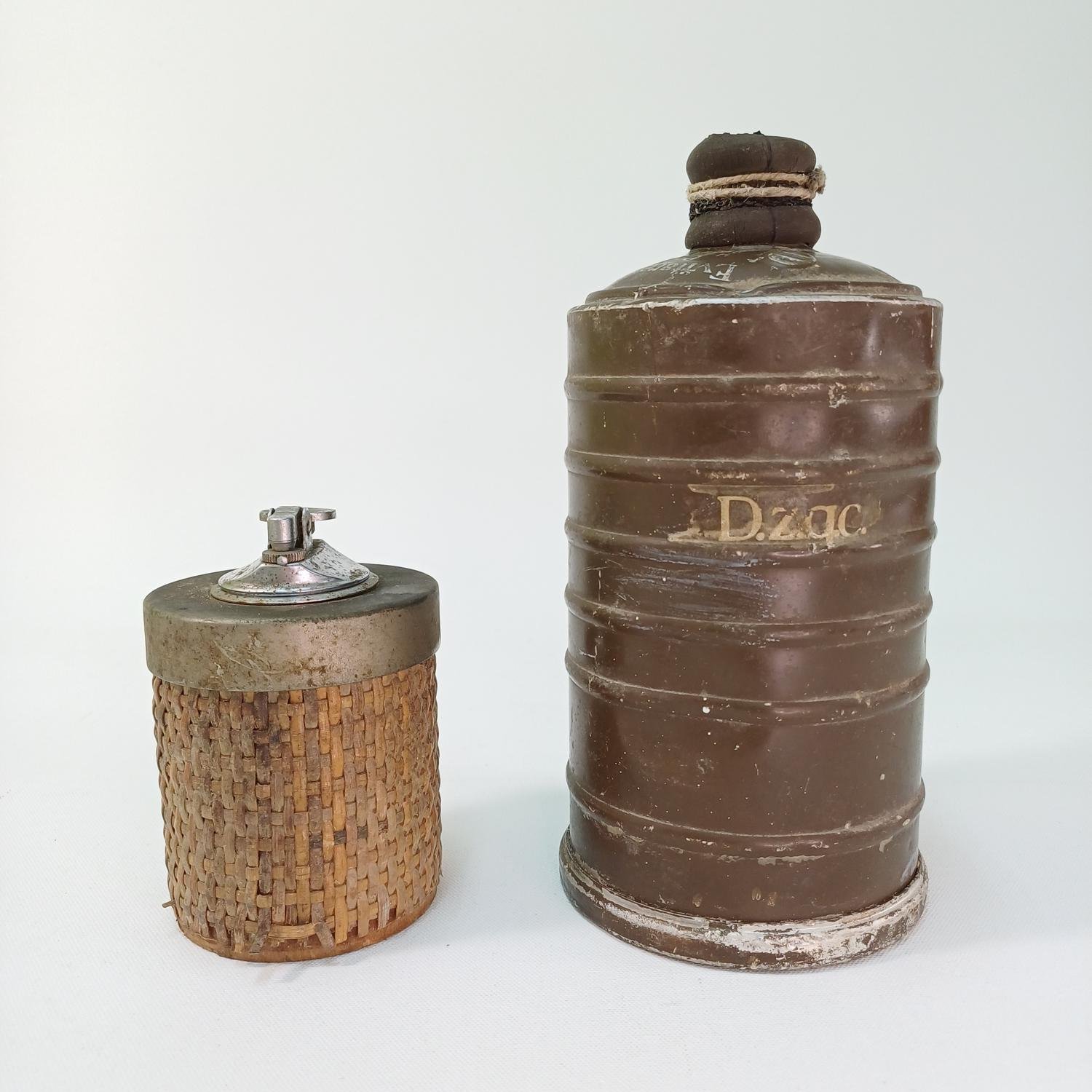 Φίλτρο μάσκας αερίων (WW II) και vintage επιτραπέζιος αναπτήρας με ψάθινο περίβλημα