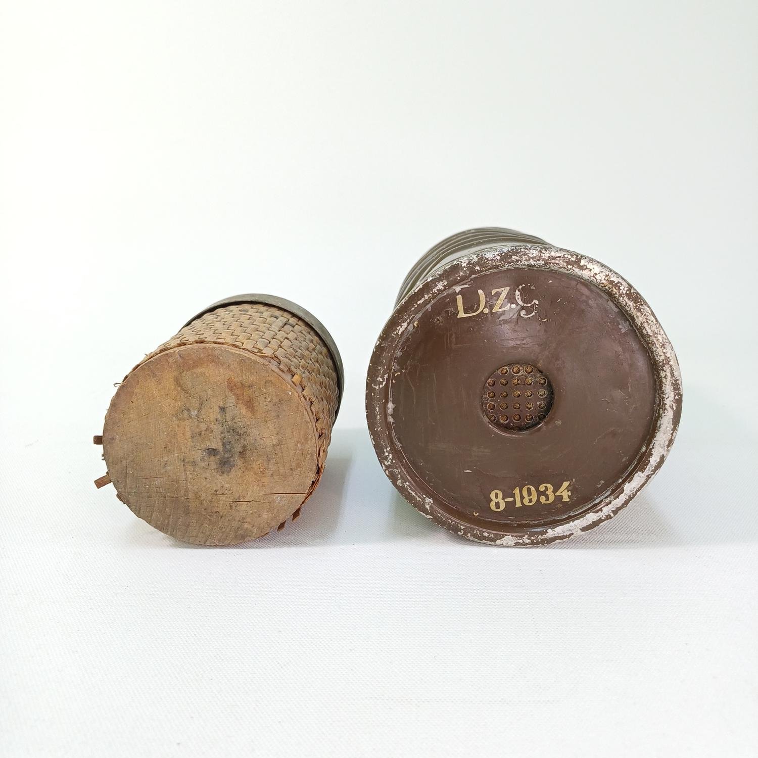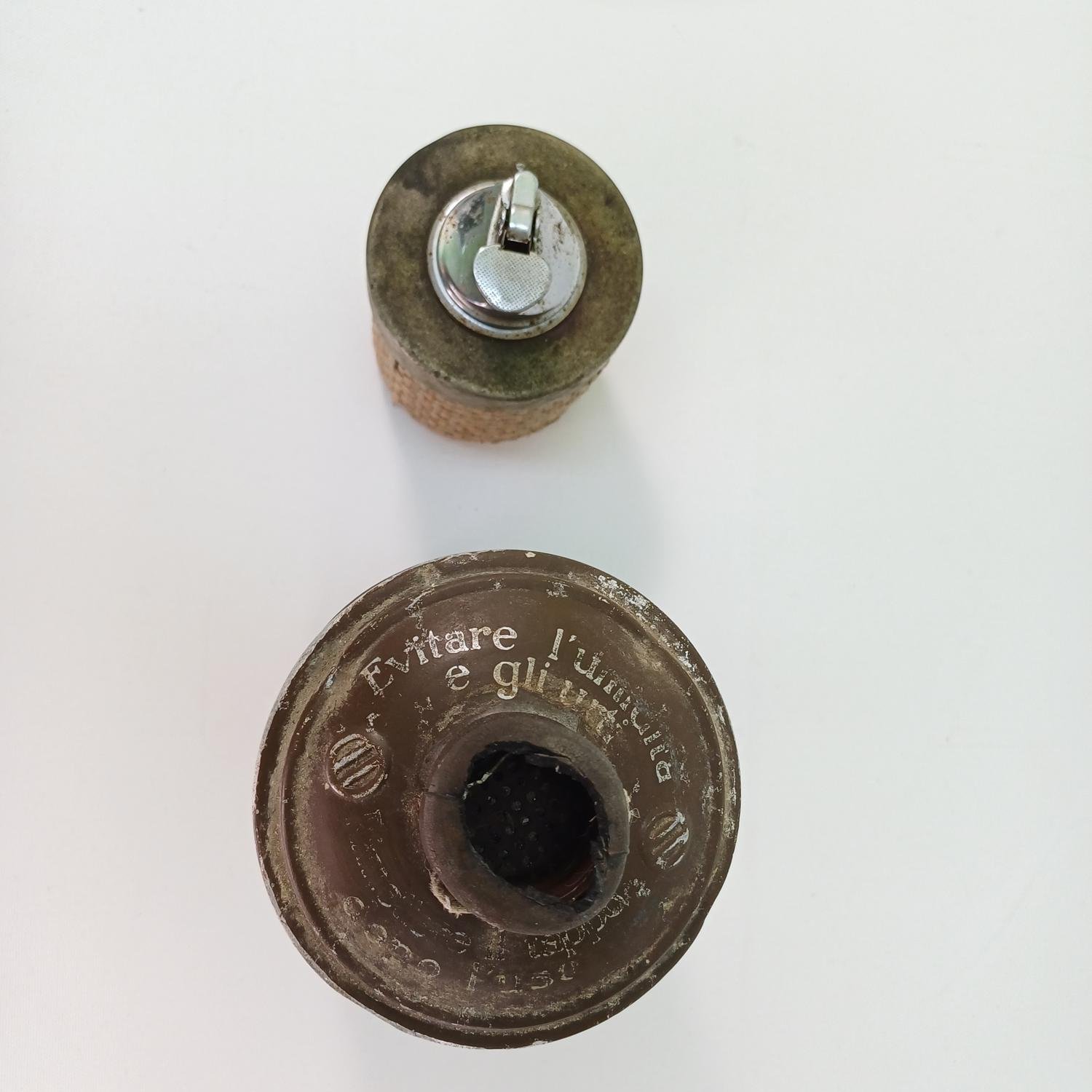 Το φίλτρο μάσκας αερίων “D.z.g.c.” χρονολογείται στην περίοδο του Β΄ Παγκοσμίου Πολέμου, έχει ύψος 22 cm και διάμετρο 10,5 cm. O vintage επιτραπέζιος αναπτήρας έχει ψάθινο περίβλημα. Είναι ύψους 12 cm και διαμέτρου 8 cm.