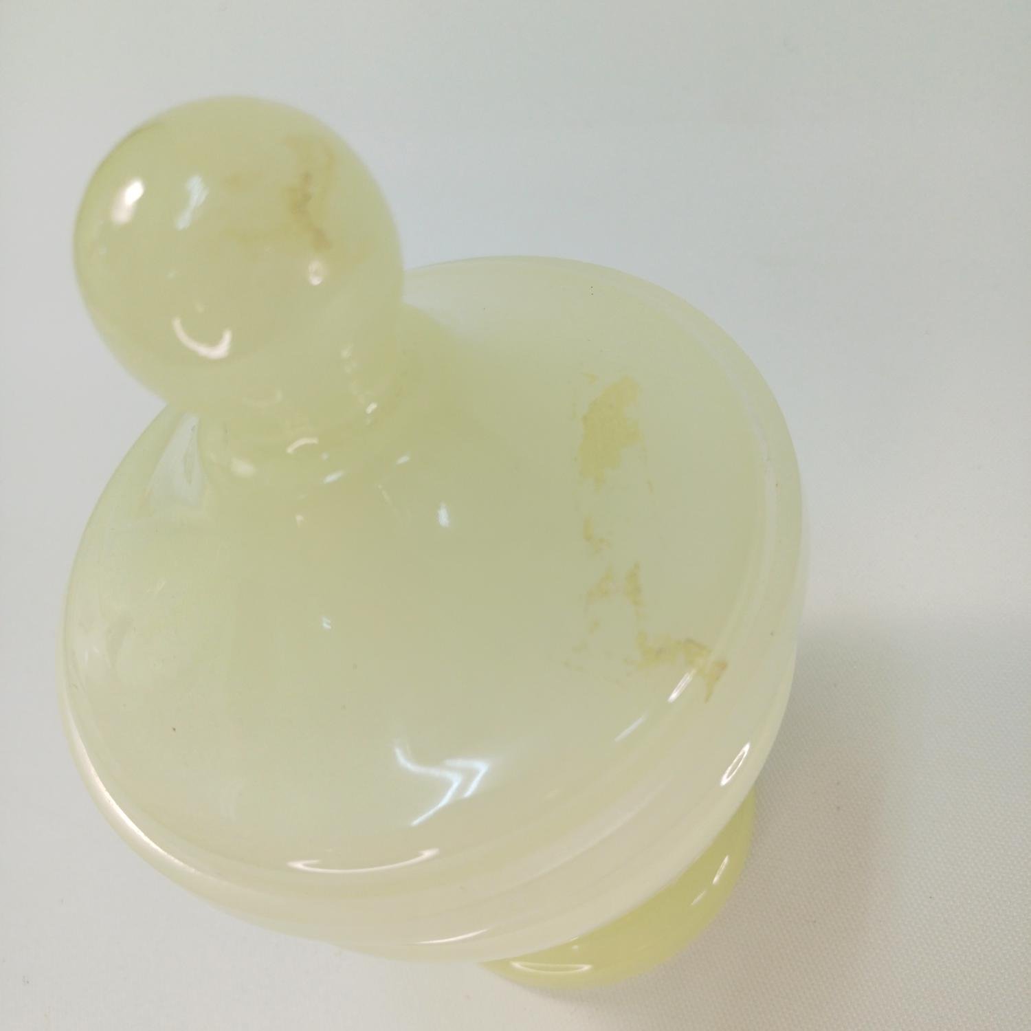Γυάλινη φοντανιέρα κίτρινης οπαλίνας με καπάκι. Έχει ύψος 17 cm μαζί με το καπάκι και είναι σε καλή κατάσταση. Υπάρχουν υπολείμματα κόλλας στο καπάκι.