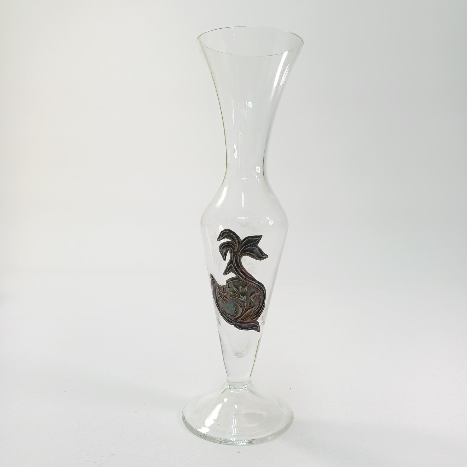 Γυάλινο βάζο με μεταλλικό σχέδιο ύψους 25,5 cm. Είναι σε καλή κατάσταση.
