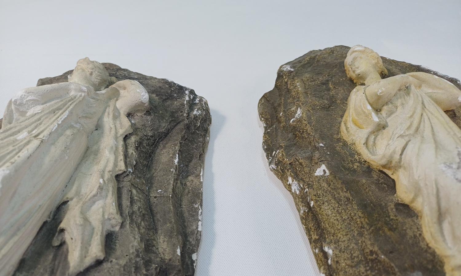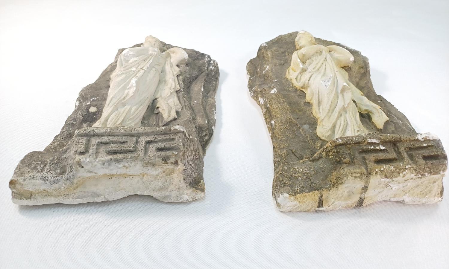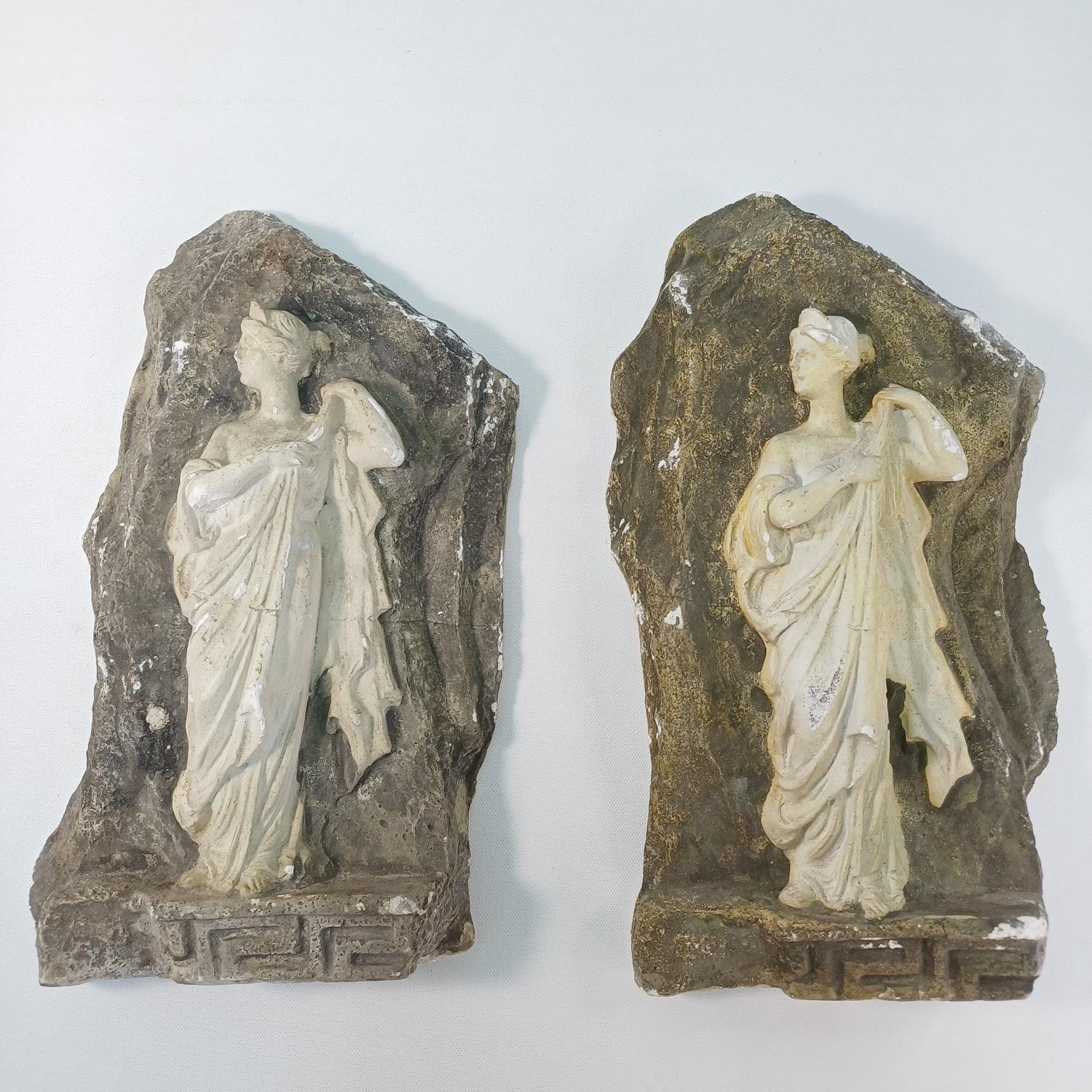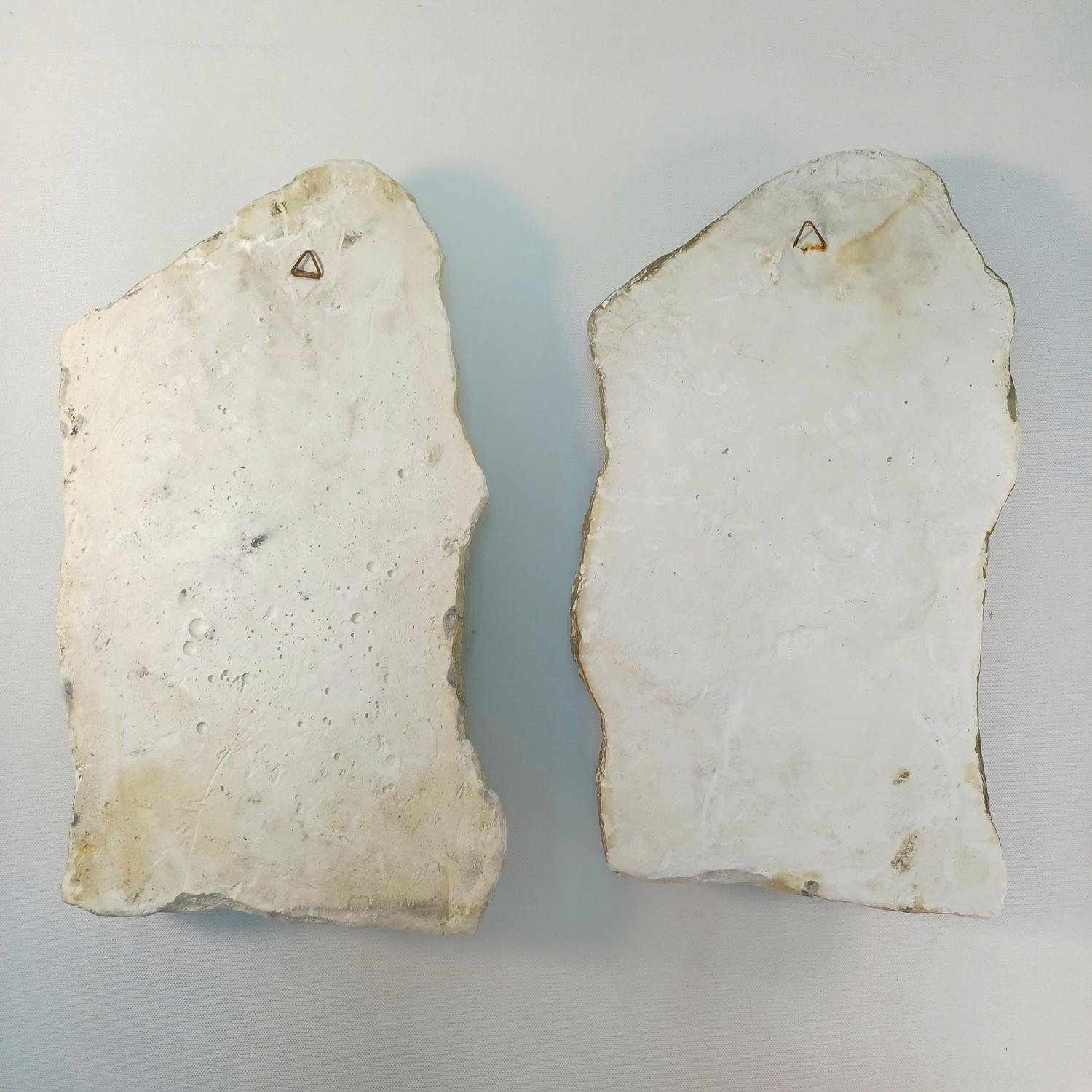 Σετ 2 γύψινων διακοσμητικών τοίχου που απεικονίζουν την Ωραία Ελένη. Έχουν διαφορετική απόχρωση μεταξύ τους και οι διαστάσεις τους είναι 32 * 19 * (πάχος 5,5 cm). Οι συγκεκριμένες μετρήσεις είναι κατά προσέγγιση λόγω της ανομοιομορφίας του σχήματος. Υπάρχουν κάποιες φθορές στον γύψο όπως επισημαίνονται στις φωτογραφίες. Διαθέτουν γάντζο κορνίζας στο πίσω μέρος.