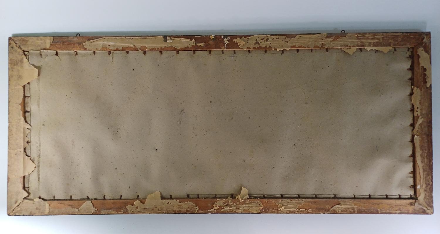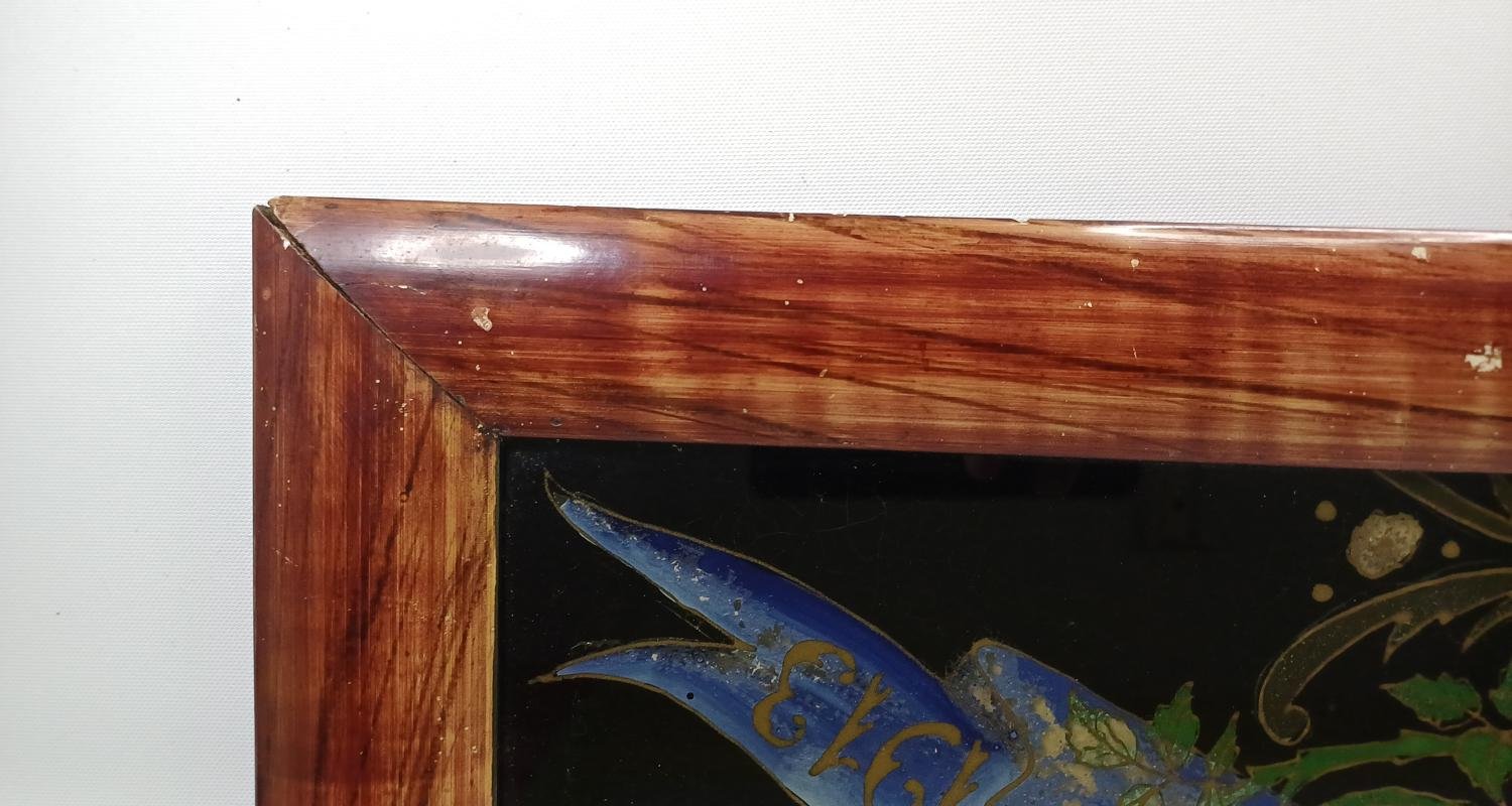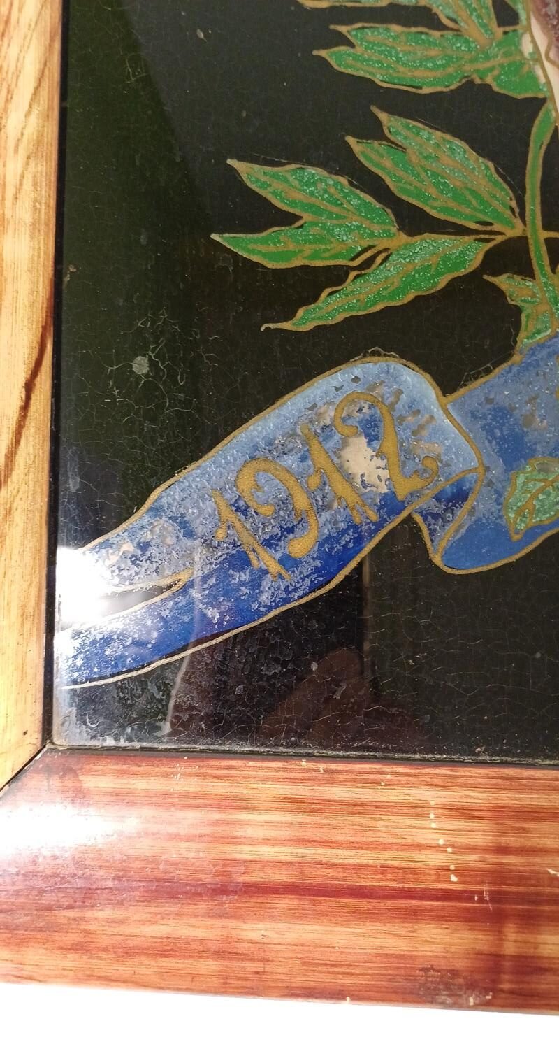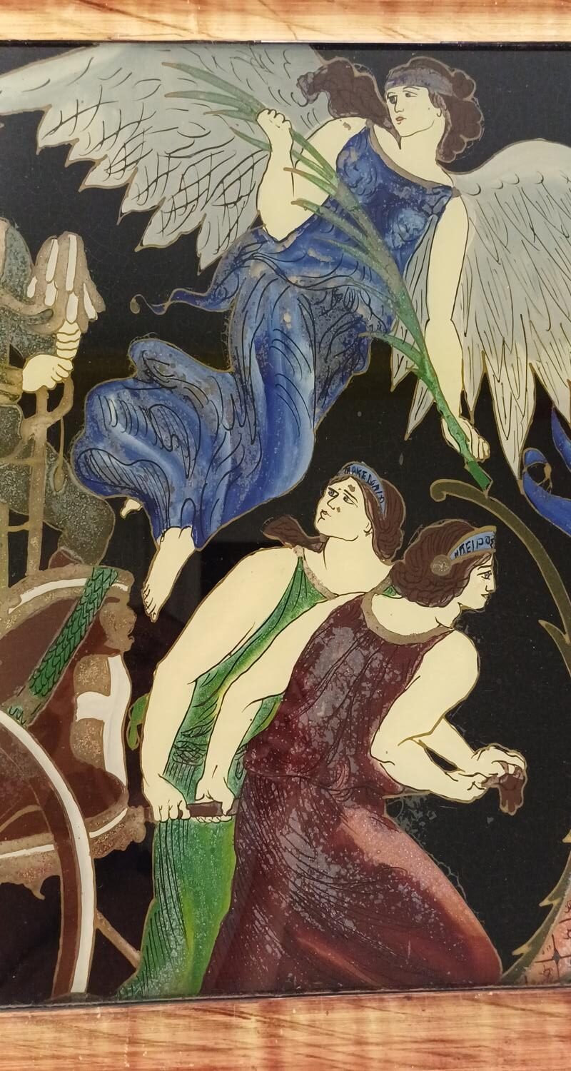 Ελαιογραφία στην πίσω όψη γυάλινης επιφάνειας σε κορνίζα διαστάσεων 1,09 m * 49 cm. Χρονολογείται στα 1912.