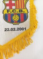 Λάβαρο ποδοσφαίρου που τιμά την αναμέτρηση μεταξύ της ΑΕΚ και της Μπαρτσελόνα για τον 4ο γύρο του Κυπέλλου UEFA τη σεζόν 2000-2001. Έχει διαστάσεις 24 cm * 20 cm. Τα κρόσσια είναι σε καλή κατάσταση και δεν υπάρχουν σκισίματα.