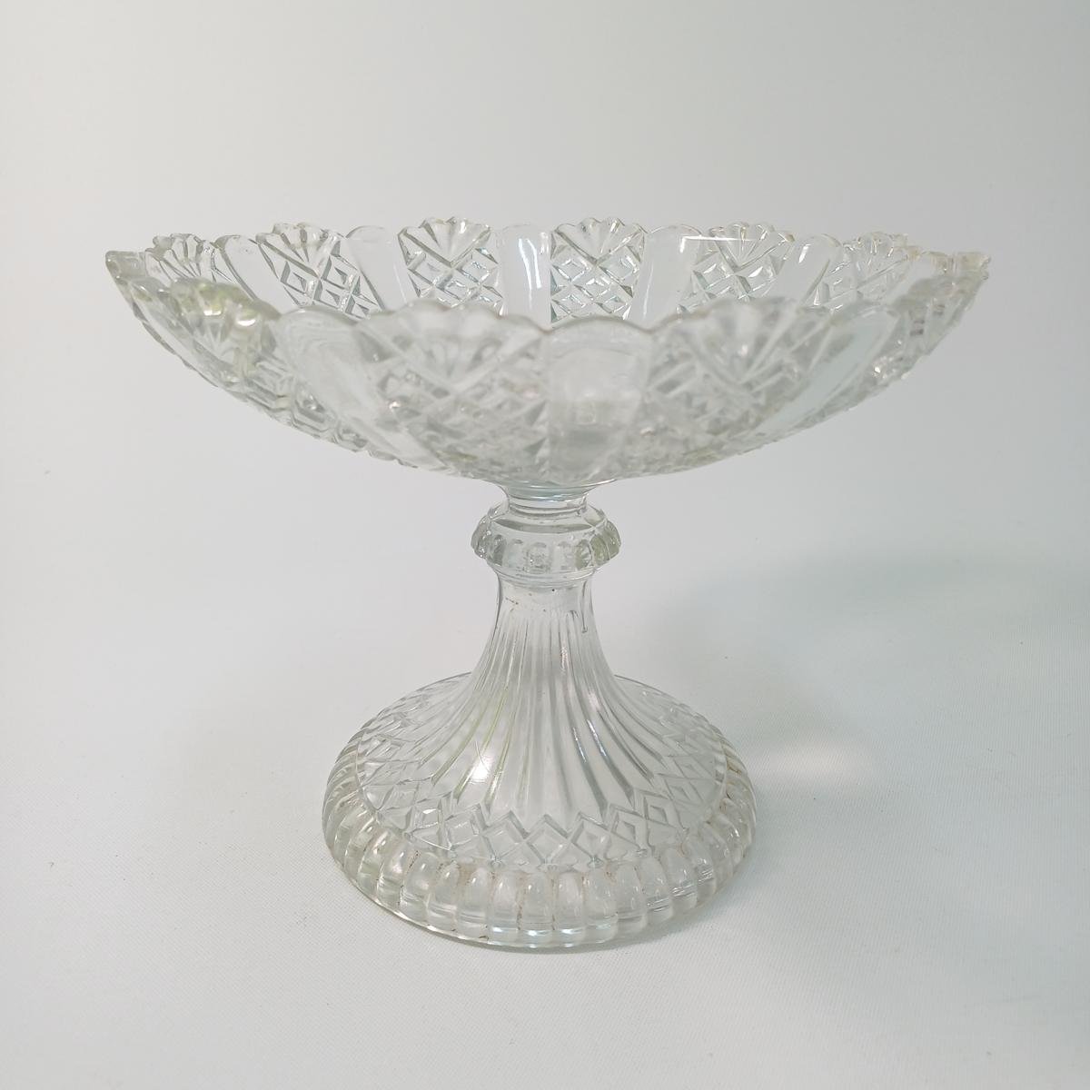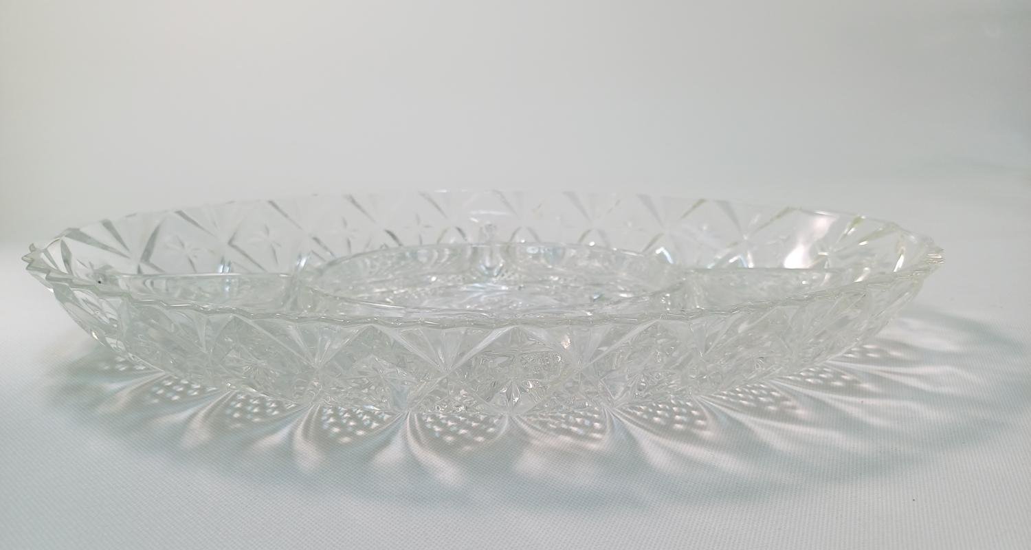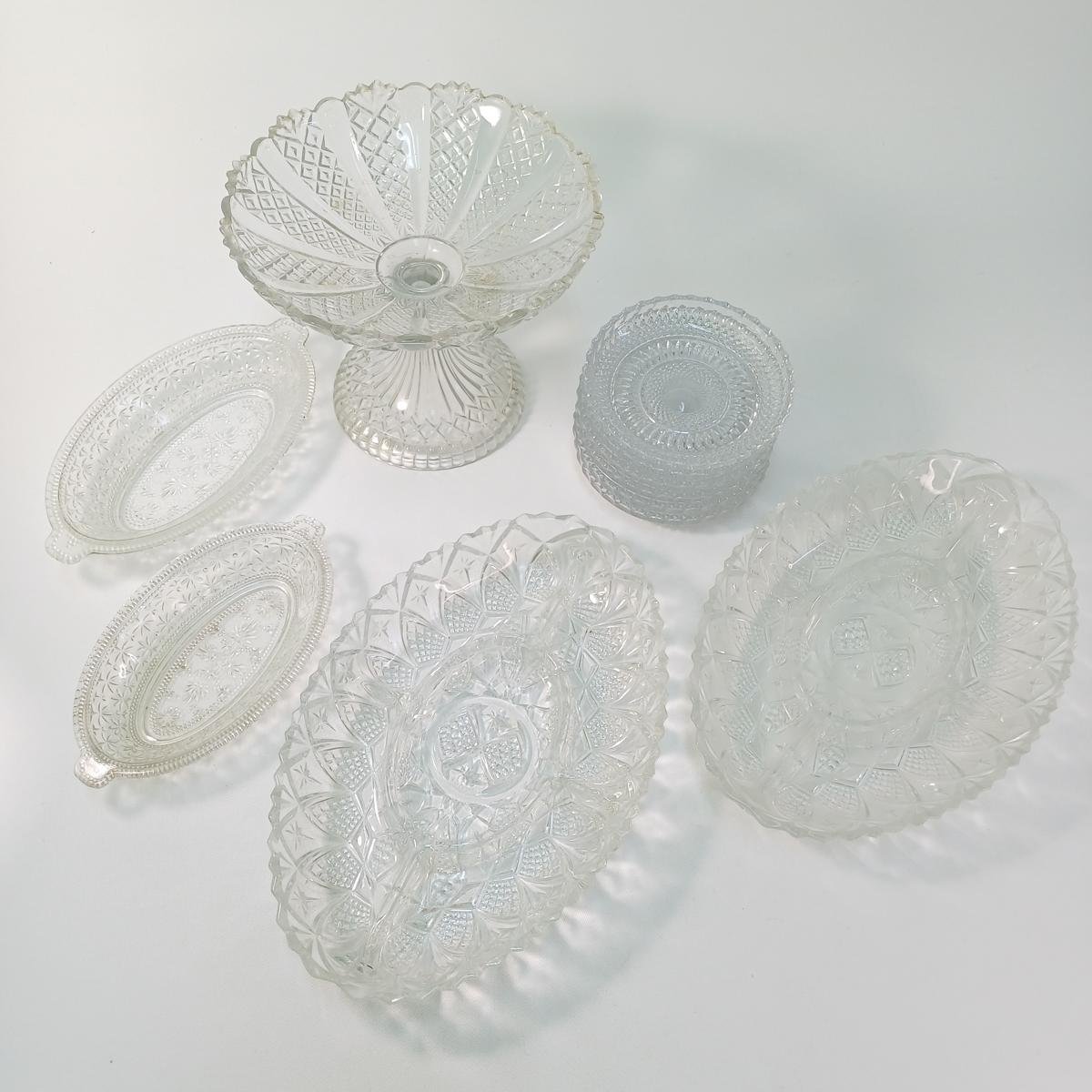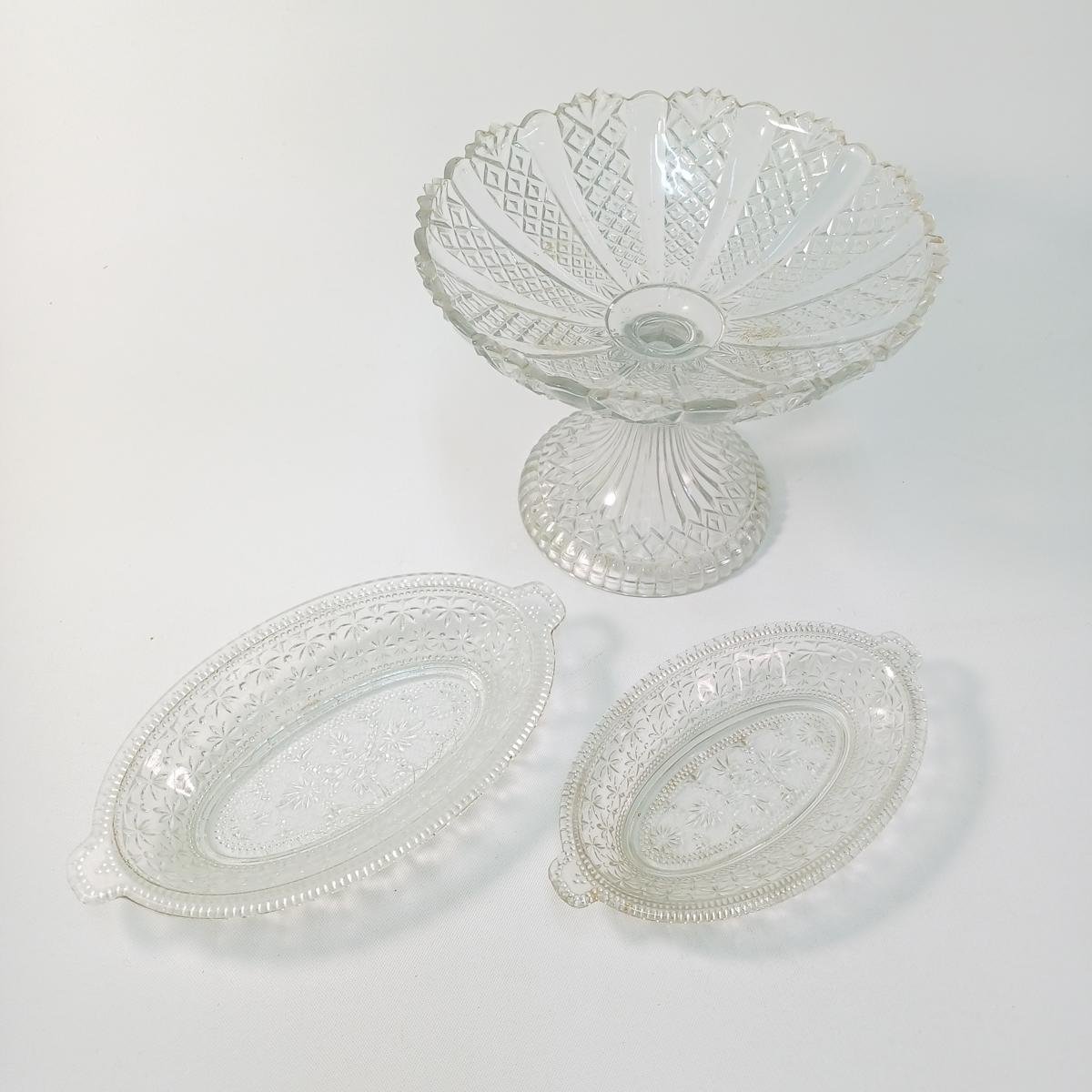 LOT 11 κρυστάλλινων και γυάλινων ειδών σερβιρίσματος. Αποτελείται από: 1) 1 γυάλινη φρουτιέρα με βάση, ύψους 18 cm και διαμέτρου 23 cm, 2) 2 κρυστάλλινες οβάλ πιατέλες ξηρών καρπών, μήκους 31,5 cm και πλάτους 20,5 cm, 3) 1 οβάλ, γυάλινο πιατάκι διαστάσεων 24 x 13,5 cm. Φέρει κάποιες γρατσουνιές στην επιφάνεια του γυαλιού. 4) 1 οβάλ, γυάλινο πιατάκι διαστάσεων 21 x 12 cm. Φέρει κάποιες γρατσουνιές στην επιφάνεια του γυαλιού. 5) 6 κρυστάλλινα πιατάκια, διαμέτρου 14 cm.