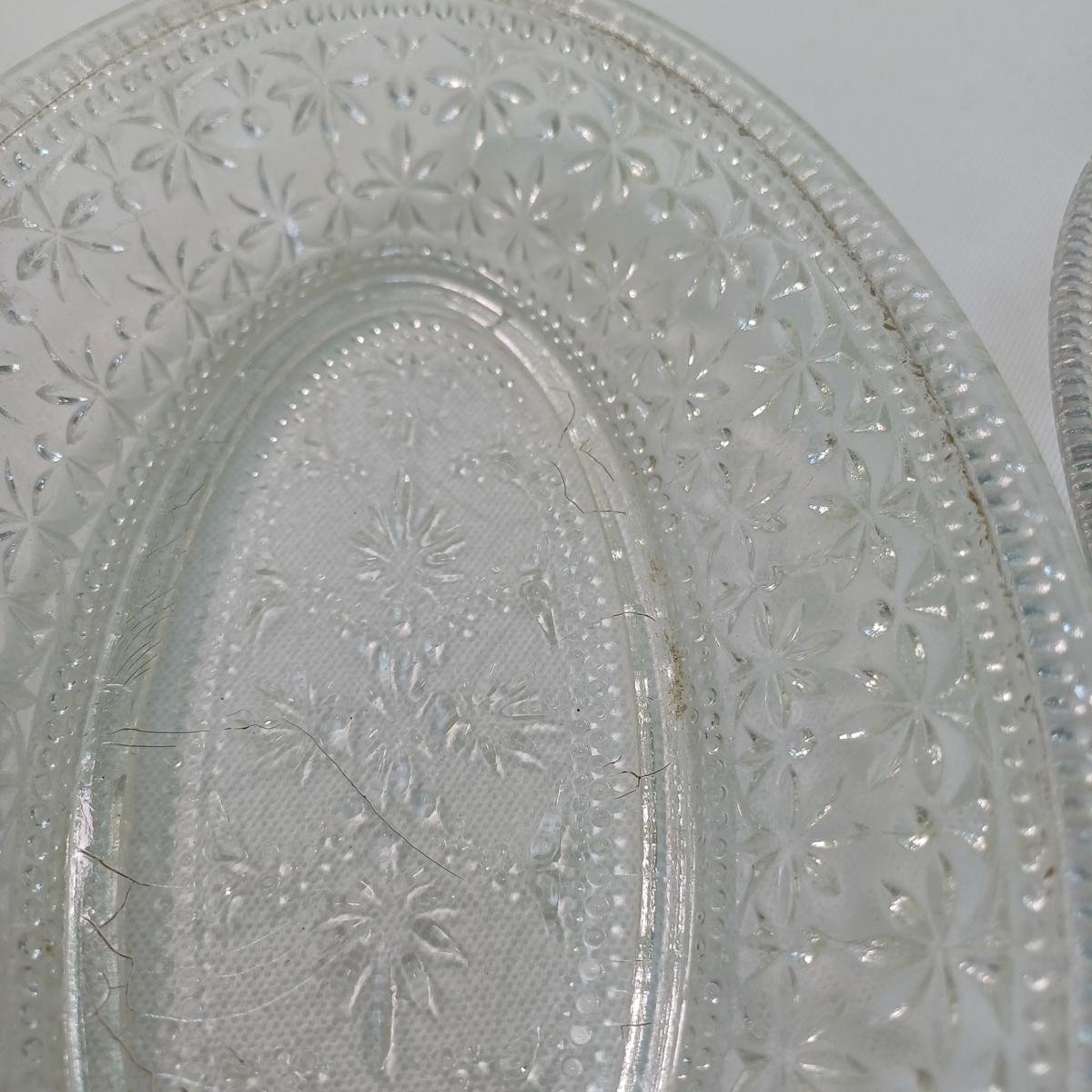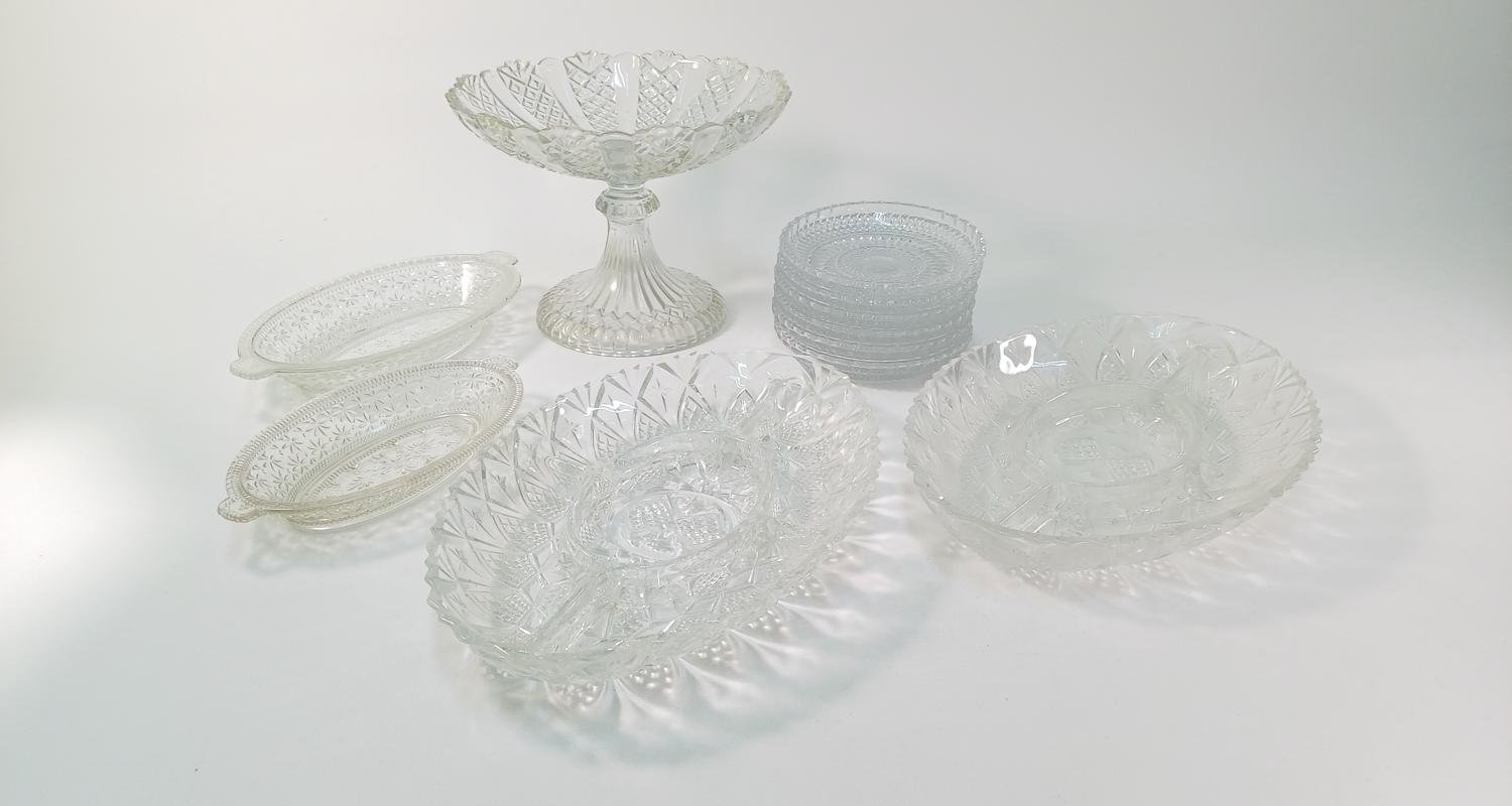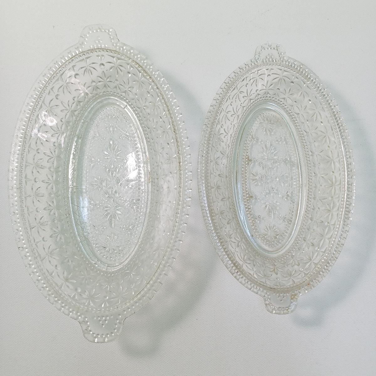 LOT 11 κρυστάλλινων και γυάλινων ειδών σερβιρίσματος. Αποτελείται από: 1) 1 γυάλινη φρουτιέρα με βάση, ύψους 18 cm και διαμέτρου 23 cm, 2) 2 κρυστάλλινες οβάλ πιατέλες ξηρών καρπών, μήκους 31,5 cm και πλάτους 20,5 cm, 3) 1 οβάλ, γυάλινο πιατάκι διαστάσεων 24 x 13,5 cm. Φέρει κάποιες γρατσουνιές στην επιφάνεια του γυαλιού. 4) 1 οβάλ, γυάλινο πιατάκι διαστάσεων 21 x 12 cm. Φέρει κάποιες γρατσουνιές στην επιφάνεια του γυαλιού. 5) 6 κρυστάλλινα πιατάκια, διαμέτρου 14 cm.