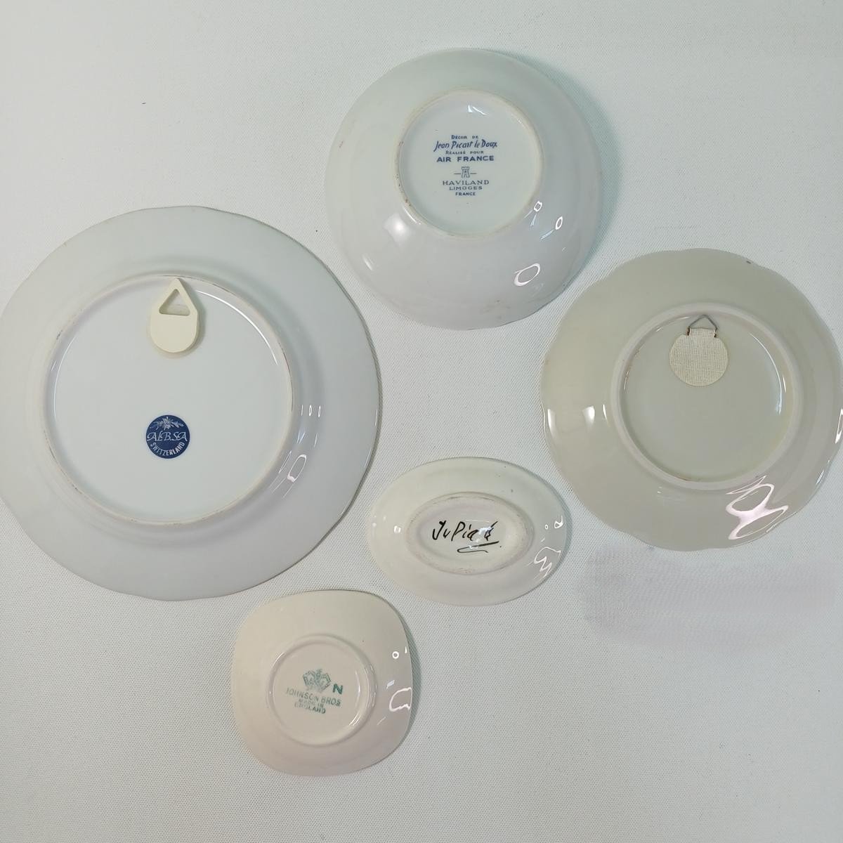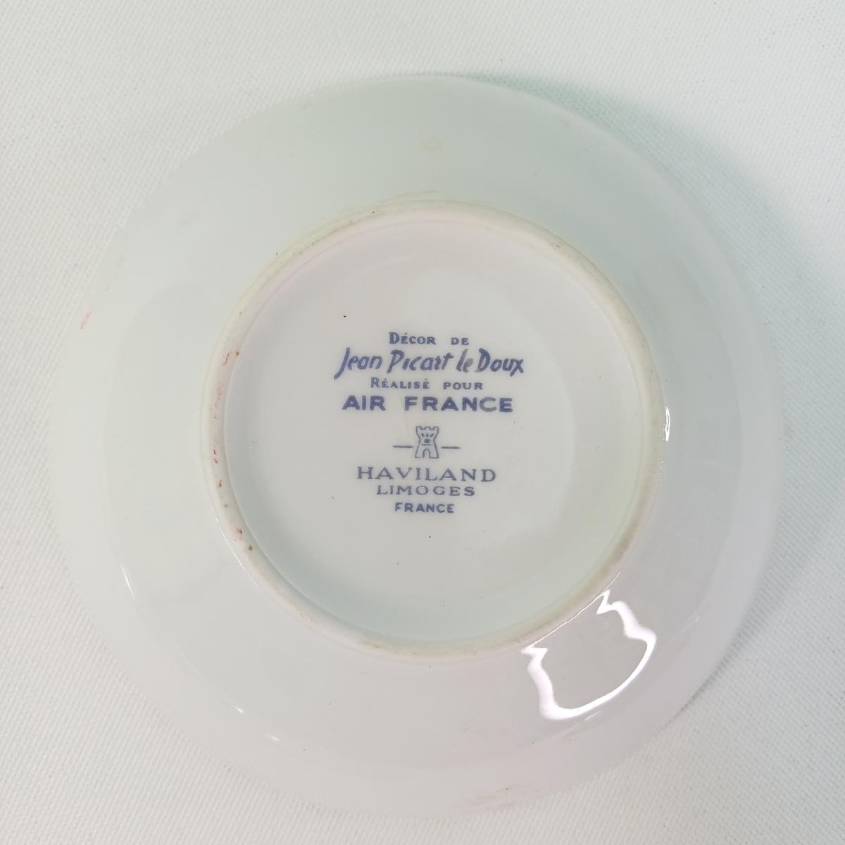 2) 1 μικρό βαθύ συλλεκτικό πιάτο της Air France, σχεδιασμένο από τον Γάλλο καλλιτέχνη Jean Picart le Doux. Χρονολογείται στη δεκαετία του 1970 και απεικονίζει το κλασικό έμβλημα του φτερωτού ιππόκαμπου της αεροπορικής εταιρείας. Το πιάτο κατασκευάστηκε από την Haviland Limoges , μια διάσημη γαλλική εταιρεία κατασκευής πορσελάνης με έδρα τη Λιμόζ της Γαλλίας. Η διάμετρός του είναι 13,5 cm και φέρει φθορά στα χρώματα.