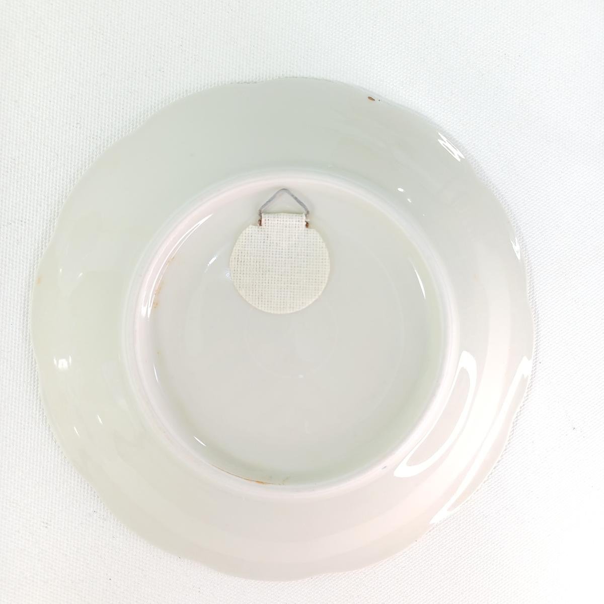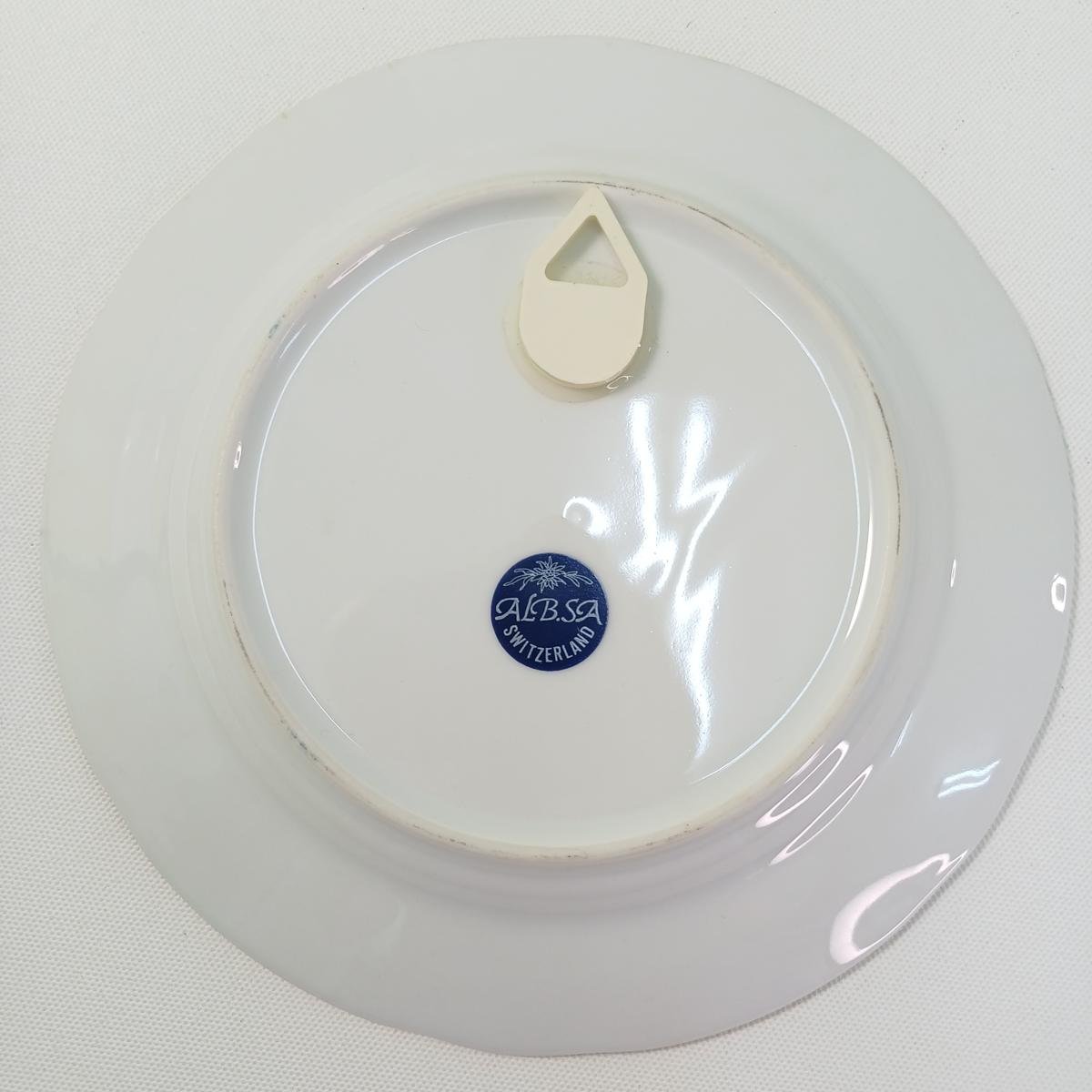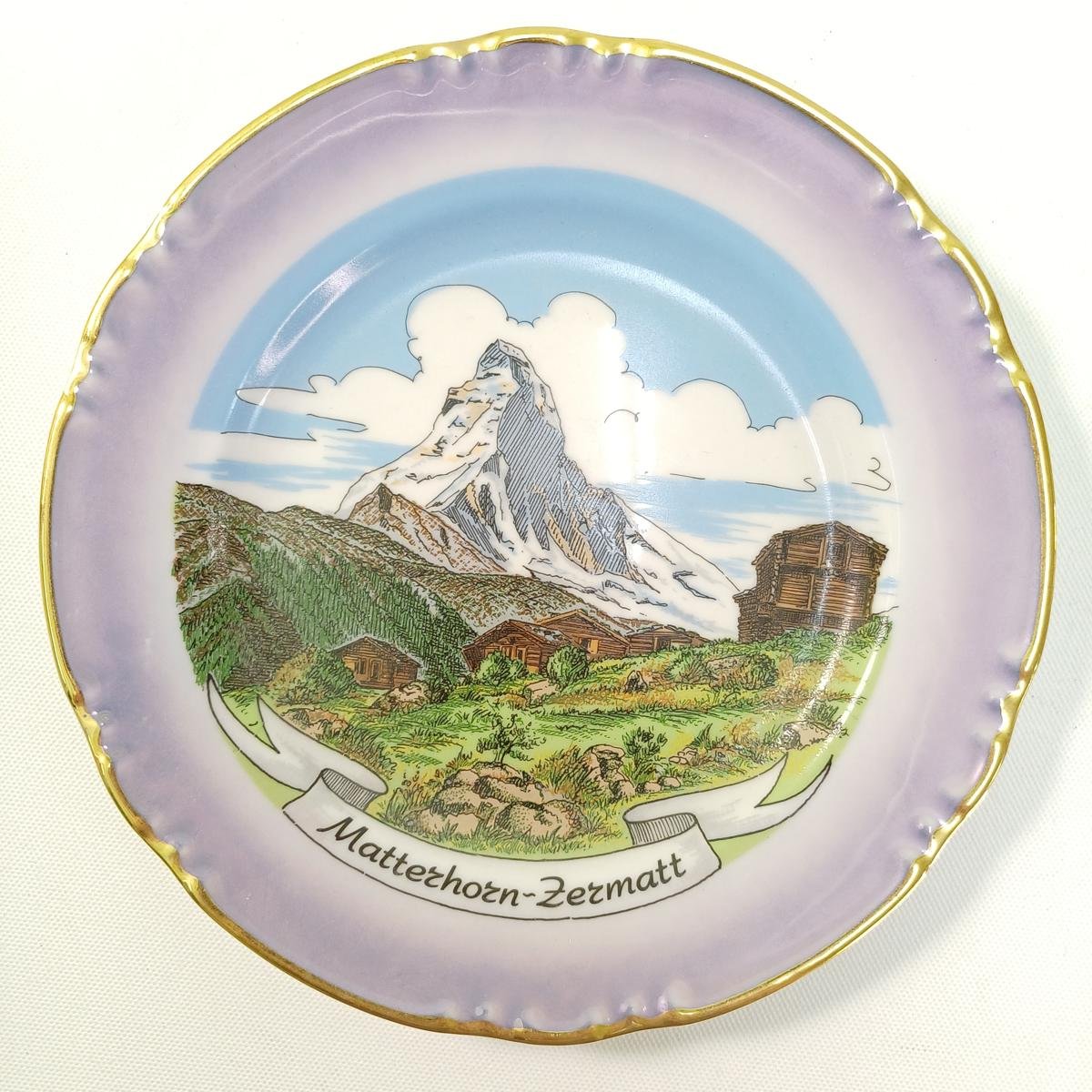 5) 1 πορσελάνινο διακοσμητικό πιάτο τοίχου, το οποίο απεικονίζει το Μάτερχορν (Matterhorn), ένα από τα πιο διάσημα βουνά των Άλπεων, που βρίσκεται στα σύνορα μεταξύ Ελβετίας και Ιταλίας. Η θέα δείχνει το χαρακτηριστικό σχήμα πυραμίδας του βουνού, με αλπικά σαλέ και πράσινα λιβάδια στο προσκήνιο, που αντιπροσωπεύουν το ελβετικό χωριό Ζερμάτ (Zermatt). Το πιάτο φέρει τη σφραγίδα “ALB.SA SWITZERLAND” και η διάμετρός του είναι 19 cm.
