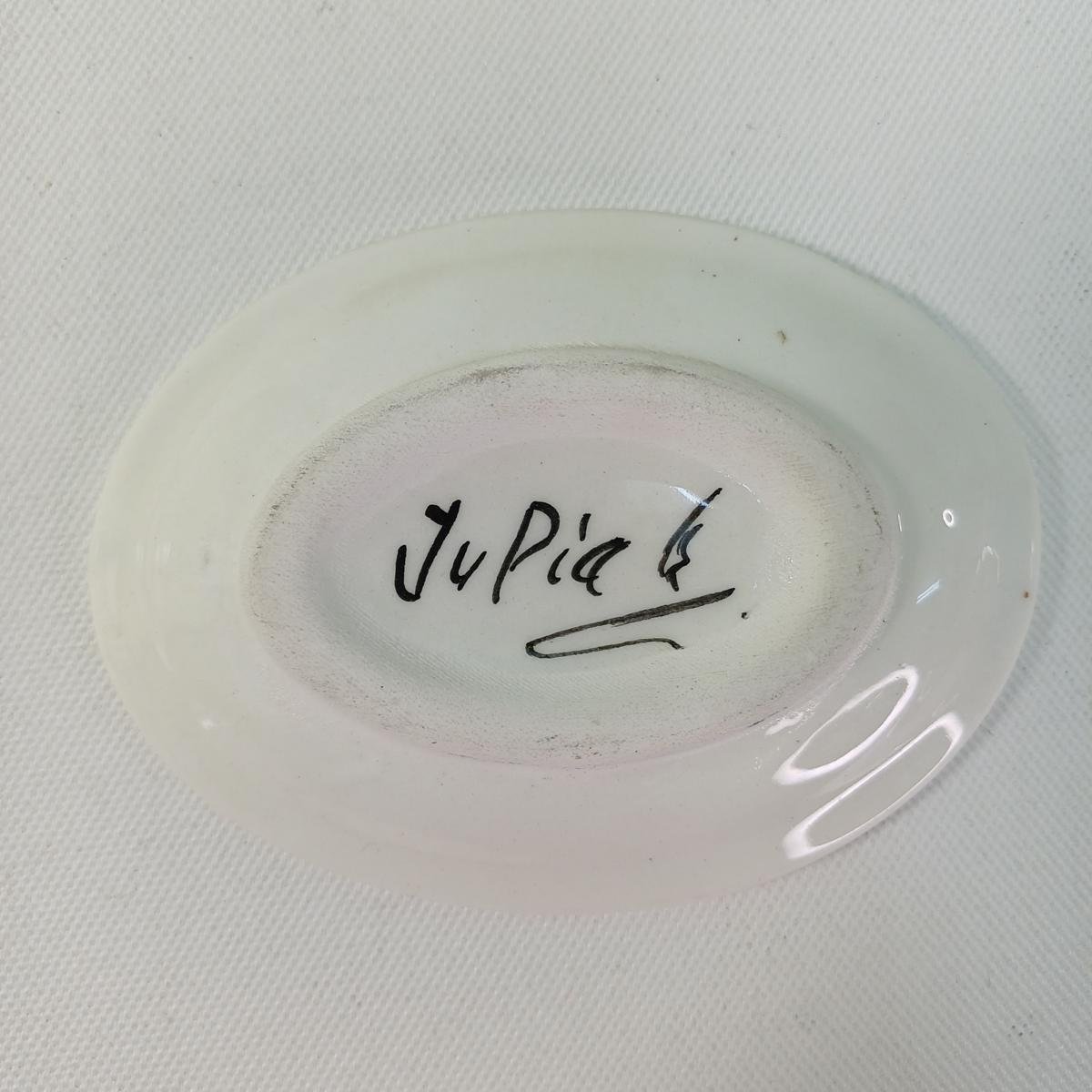 3) 1 κεραμικό διακοσμητικό πιατάκι με την υπογραφή “Jupia” και νησιώτικο θέμα. Οι διαστάσεις του είναι 9,5 x 7 cm.