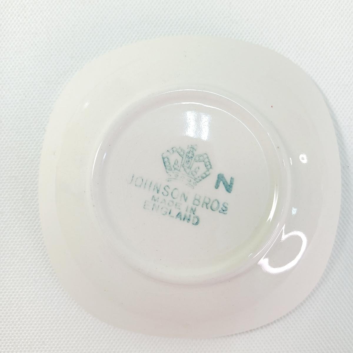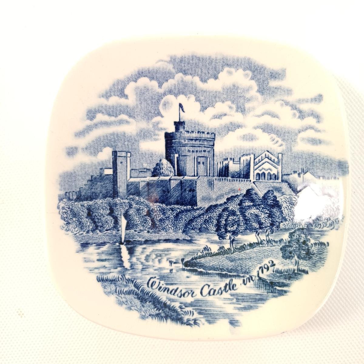4) 1 πορσελάνινο μικρό πιατάκι το οποίο απεικονίζει το Windsor Castle (Κάστρο του Ουίνδσορ) όπως ήταν το έτος 1792. Φέρει τη σφραγίδα “JOHNSON BROS- MADE IN ENGLAND” και το γράμμα “Ν”. Αυτό το στυλ οπίσθιας σφραγίδας χρησιμοποιήθηκε στα μέσα του 20ού αιώνα, συχνά μεταξύ της δεκαετίας του 1940 και του 1960, αν και η ακριβής χρονολόγηση μπορεί να διαφέρει ανάλογα με το σχέδιο. Το σήμα της κορώνας ήταν ένα κοινό χαρακτηριστικό στην επωνυμία τους, συμβολίζοντας την ποιότητα και τη βρετανική δεξιοτεχνία. Οι διαστάσεις του είναι 8,5 x 8,5 cm.