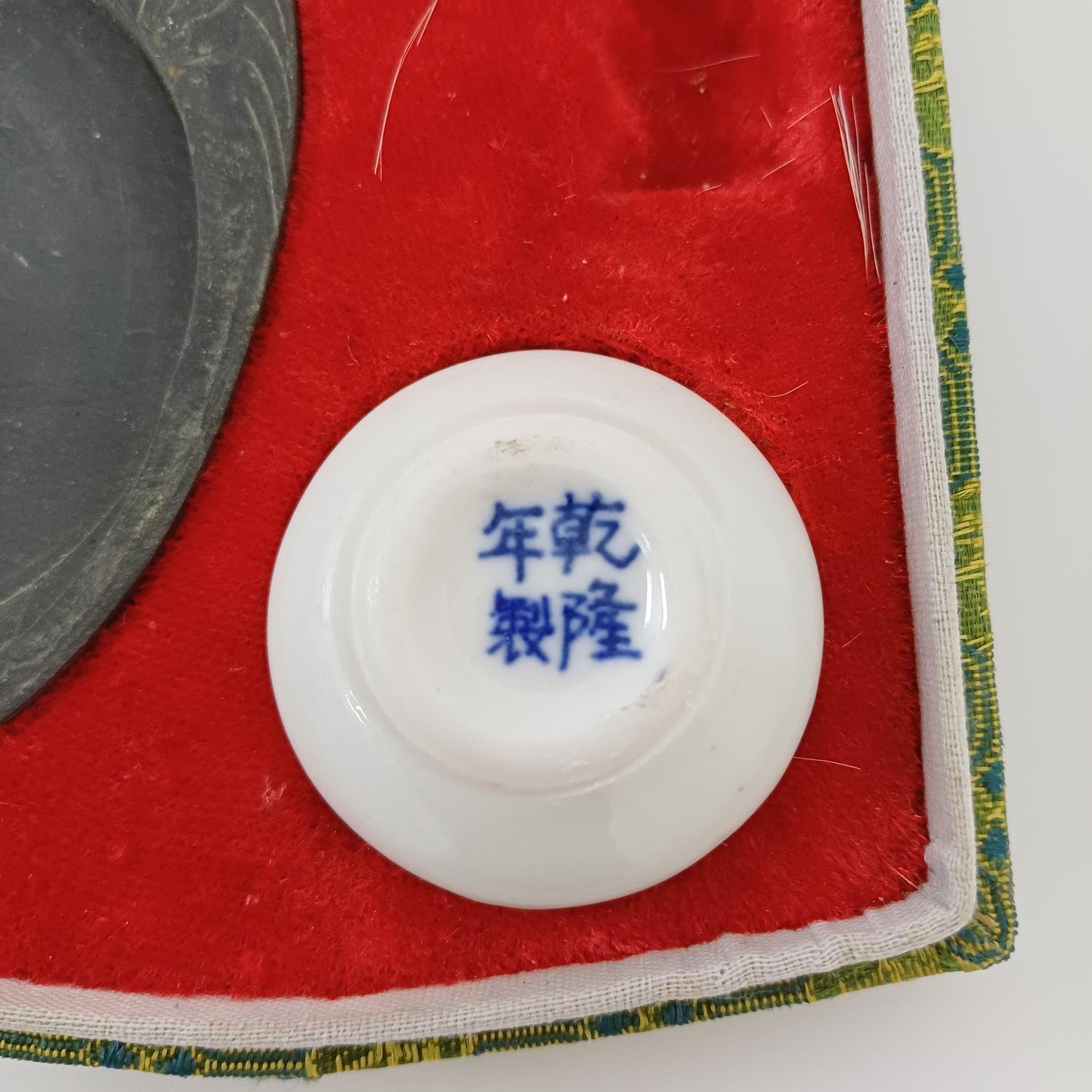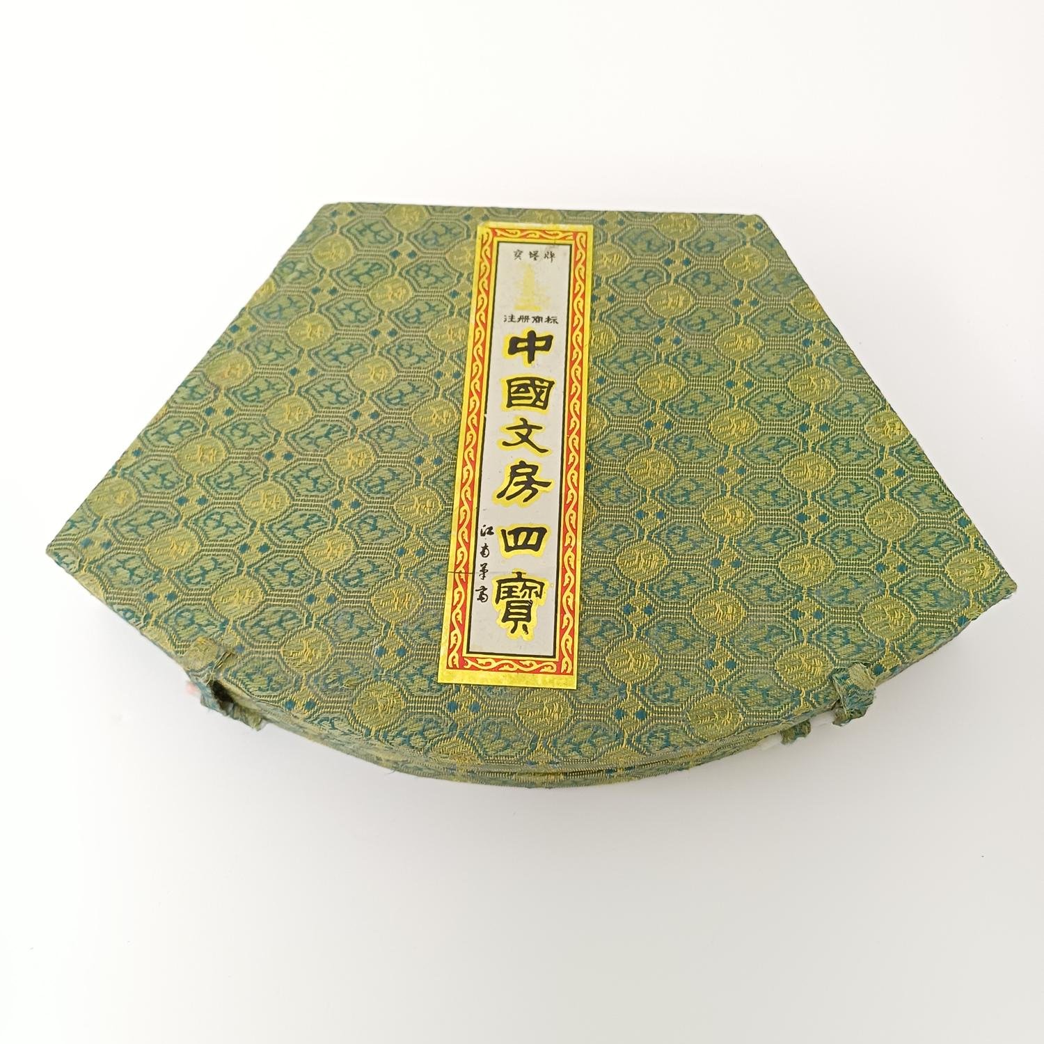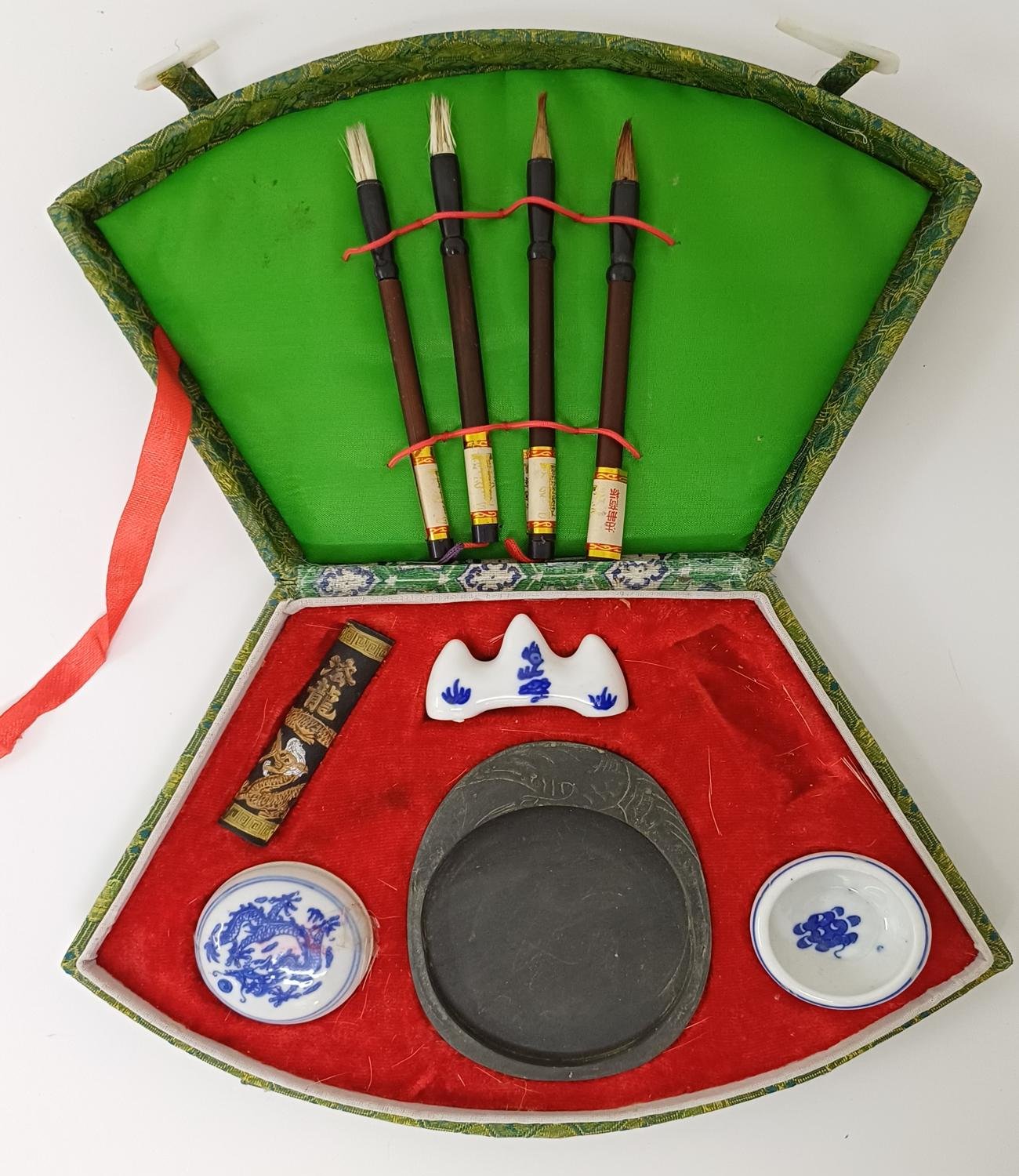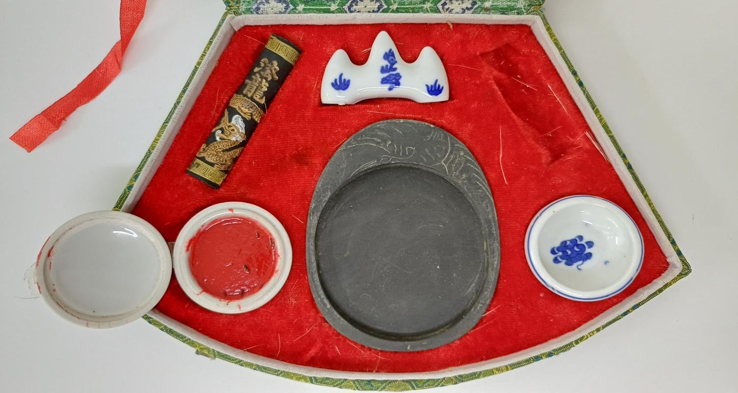 Παραδοσιακό σετ κινεζικής καλλιγραφίας, γνωστό και ως ‘Τα Τέσσερα Κοσμήματα της Μελέτης’. Το σετ περιλαμβάνει: 4 πινέλα με διαφορετικά μεγέθη και τύπους τρίχας, 1 ράβδος μελανιού, 1 πέτρα μελανιού στην οποία τρίβεται η ράβδος μελανιού με νερό για τη δημιουργία μελανιού, 1 βάση για τα πινέλα όταν δεν χρησιμοποιούνται και 2 πορσελάνινα μπολάκια (το ένα περιέχει κόκκινη μπογιά). Απουσιάζει ένα αντικείμενο το οποίο είναι η πέτρινη ράβδος που συγκρατεί το χαρτί. Τέτοιου είδους σετ χρησιμοποιούνται εδώ και αιώνες στην Κίνα και αποτελούν σημαντικό μέρος της κινεζικής τέχνης και κουλτούρας.