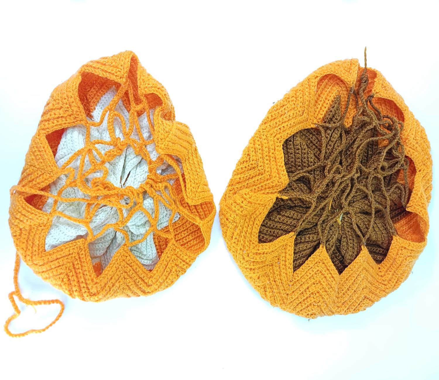 Σετ πλεκτού χειροποίητου ριχταριού και 2 στρογγυλών μαξιλαροθηκών σε πορτοκαλί- καφέ αποχρώσεις