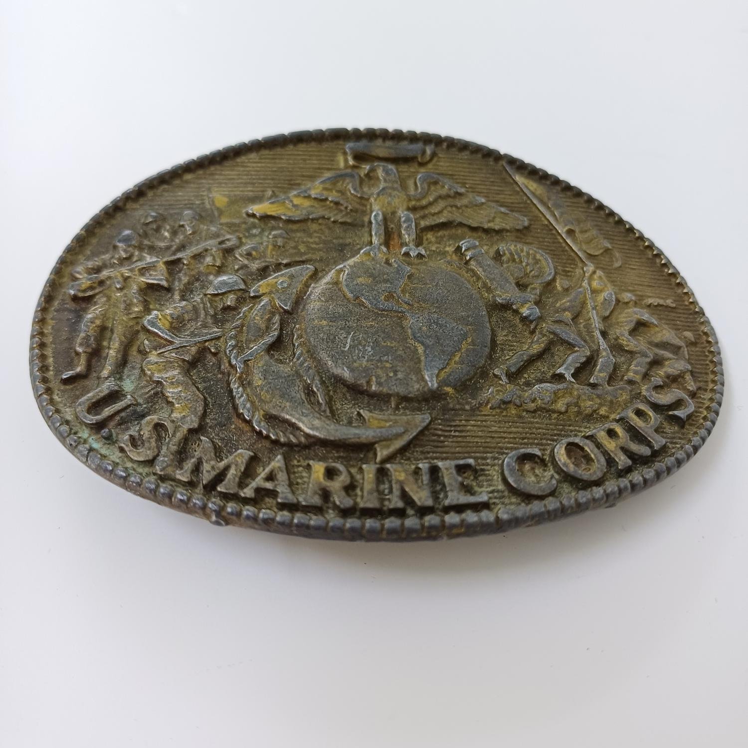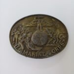 Πόρπη στρατιωτικής ζώνης του Σώματος Πεζοναυτών των Ηνωμένων Πολιτειών (U.S. Marine Corps). Αυτή η πόρπη είναι ένα κομμάτι στρατιωτικού αναμνηστικού και φέρει το έμβλημα του Σώματος Πεζοναυτών, το οποίο περιλαμβάνει έναν αετό, μια υδρόγειο και μια άγκυρα. Το έμβλημα αυτό είναι γνωστό ως “Eagle, Globe, and Anchor” και είναι το επίσημο σύμβολο του Σώματος Πεζοναυτών το οποίο ιδρύθηκε το 1775.