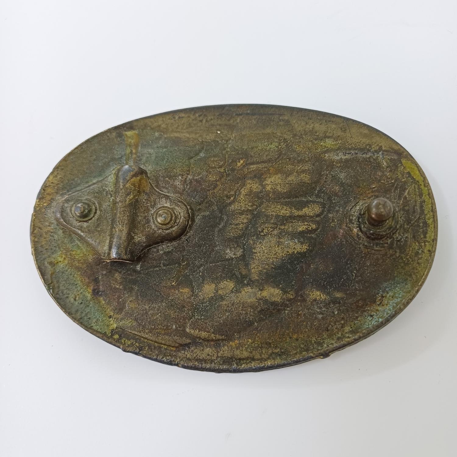 Το μέταλλο της πόρπης έχει οξειδωθεί λόγω παλαιότητας και οι διαστάσεις της είναι 9 x 6,5 cm.