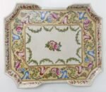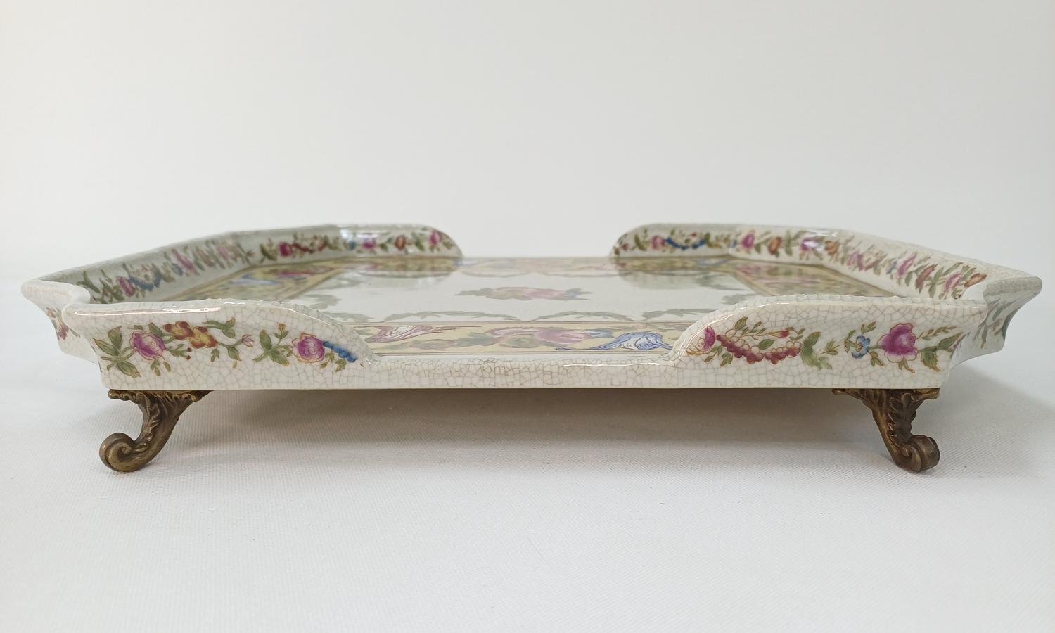 Διακοσμητικός πορσελάνινος δίσκος ζωγραφισμένος με λουλούδια και περίτεχνα σχέδια. Έχει μπρούτζινα πόδια και η πορσελάνη έχει κρακελέ μορφή. Είναι χαρακτηριστική κατασκευής της εταιρείας Wong Lee (China) 1895 όπως αναγράφεται στην σφραγίδα από κάτω. Η εταιρεία έχει έτος ίδρυσης το 1995, ενώ η χρονολογία 1895 που χρησιμοποιεί στα προϊόντα της είναι για να τιμήσει τα 100 χρόνια του τέλους του πολέμου μεταξύ Κίνας και Ιαπωνίας. Έχει διαστάσεις 34,5 * 28 *5 cm και είναι σε άριστη κατάσταση.