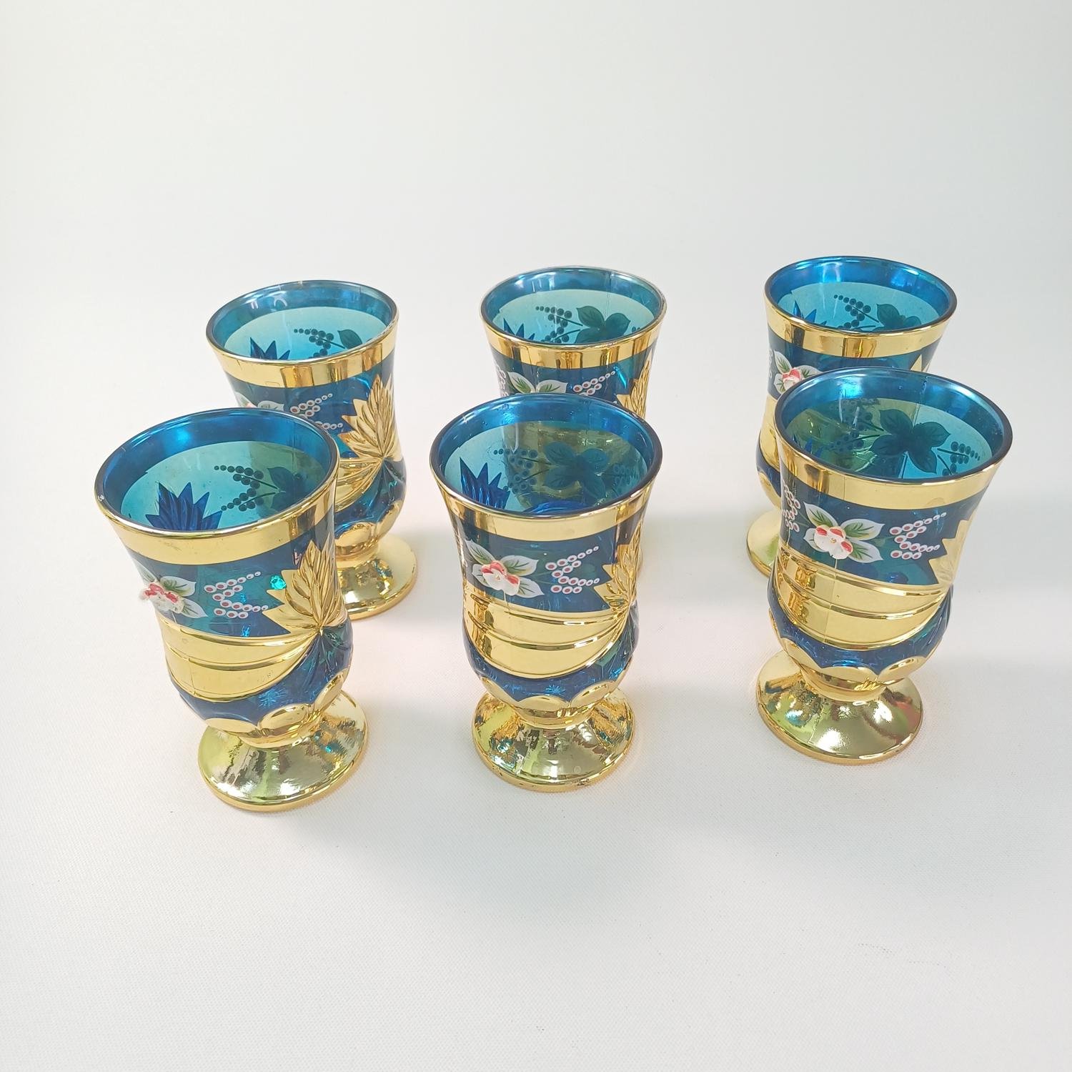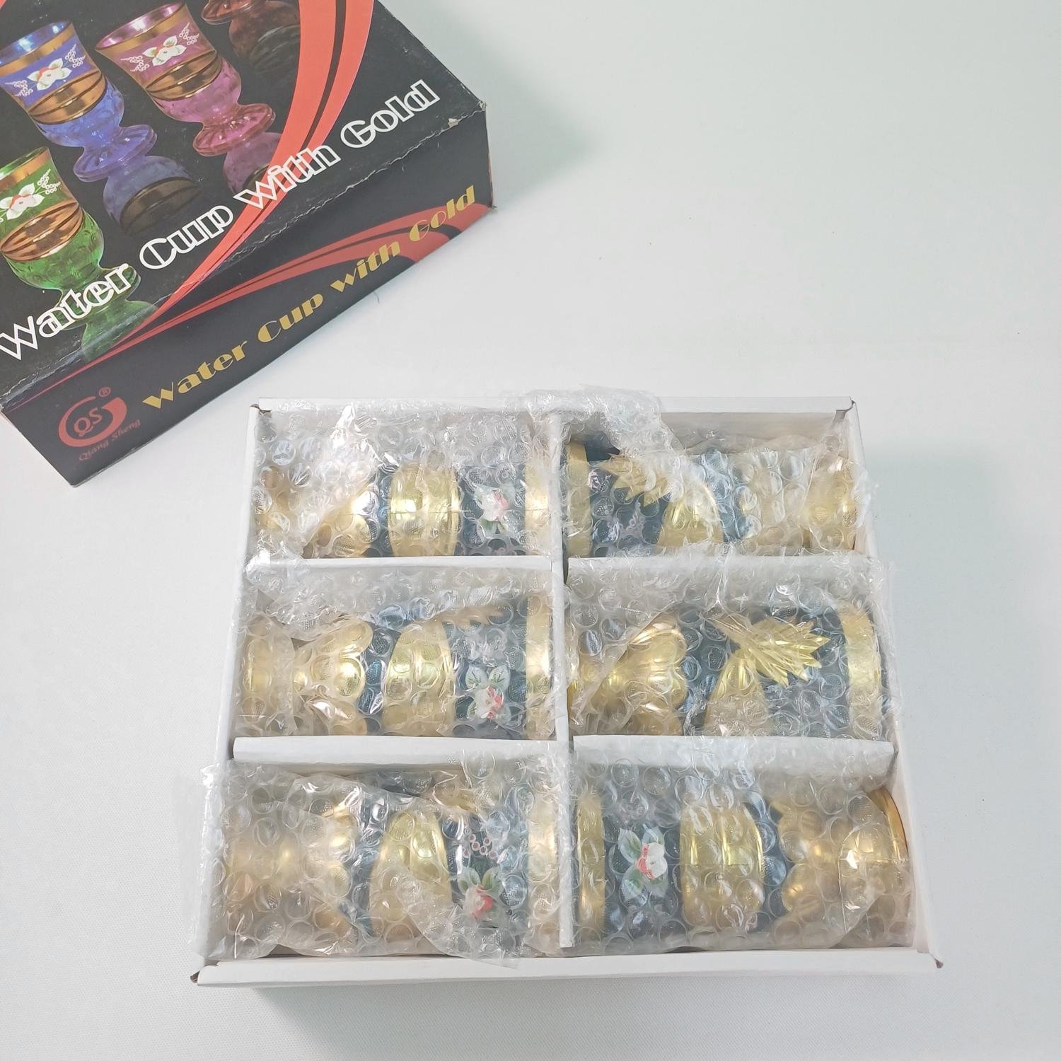 Σετ 6 διακοσμητικών ποτηριών σε μπλε χρώμα με ανάγλυφο λουλούδι. Έχουν ύψος 12 cm και διάμετρο 7 cm. Είναι σε καλή κατάσταση και βρίσκονται στο κουτί τους. Το κουτί φέρει την ονομασία ‘Water cup with gold’ της εταιρείας Qiang Sheng.