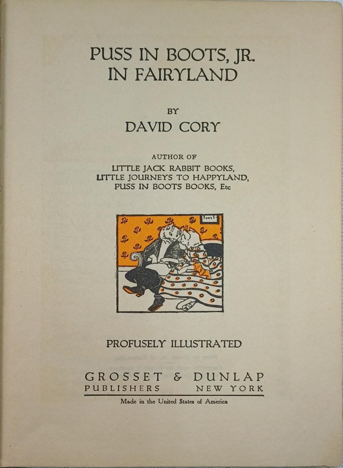 Το βιβλίο “Puss-In-Boots, Jr. In Fairyland” του David Cory ακολουθεί τις περιπέτειες του γιου του διάσημου Puss in Boots, ο οποίος ταξιδεύει μέσα σε μια μαγική χώρα των παραμυθιών. Κατά τη διάρκεια του ταξιδιού του, συναντά και αλληλεπιδρά με διάσημους χαρακτήρες όπως τα Three Little Kittens και τον Little Boy Blue. Ο Cory χρησιμοποίησε αυτές τις ιστορίες, γραμμένες αρχικά ως ιστορίες πριν τον ύπνο, για να προσφέρει διασκεδαστικές αφηγήσεις με ανθρωπομορφικά ζώα και ευγενικά ηθικά διδάγματα.