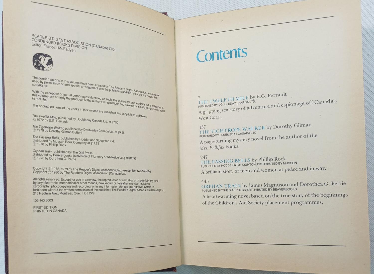 Ο τόμος Reader’s Digest Condensed Books είναι μια συλλογή συντομευμένων εκδόσεων μυθιστορημάτων και μη-λογοτεχνικών έργων. Περιλαμβάνει έργα διάσημων συγγραφέων, από κλασικούς μέχρι σύγχρονους best-seller. Ο συγκεκριμένος τόμος περιλαμβάνει τις ιστορίες: “The twelfth mile”, “The tightrope walker”, “The passing bells” και “Orphan train”.