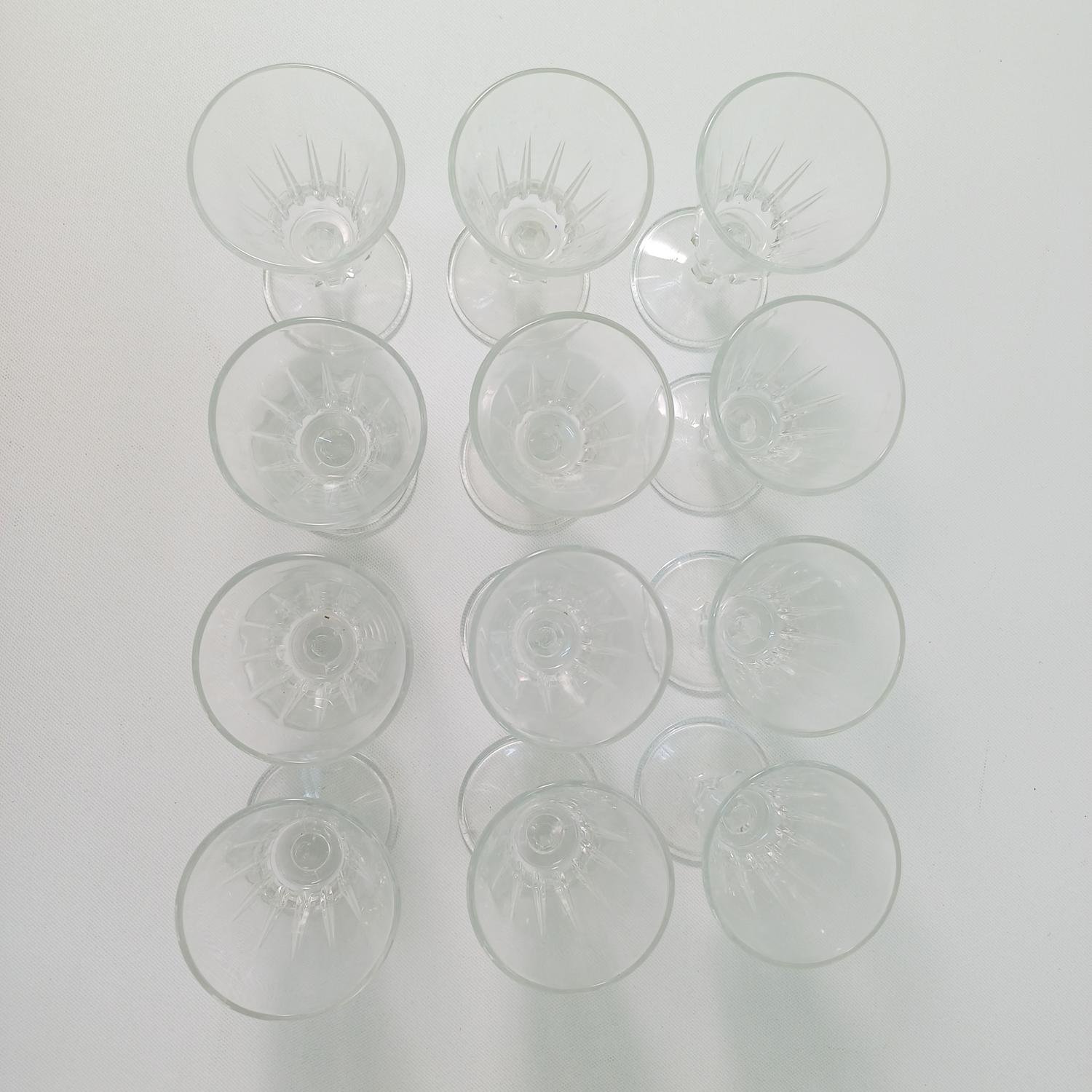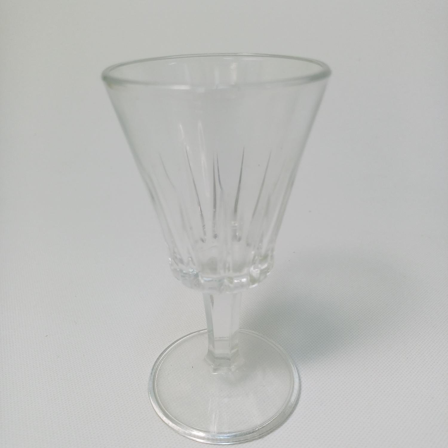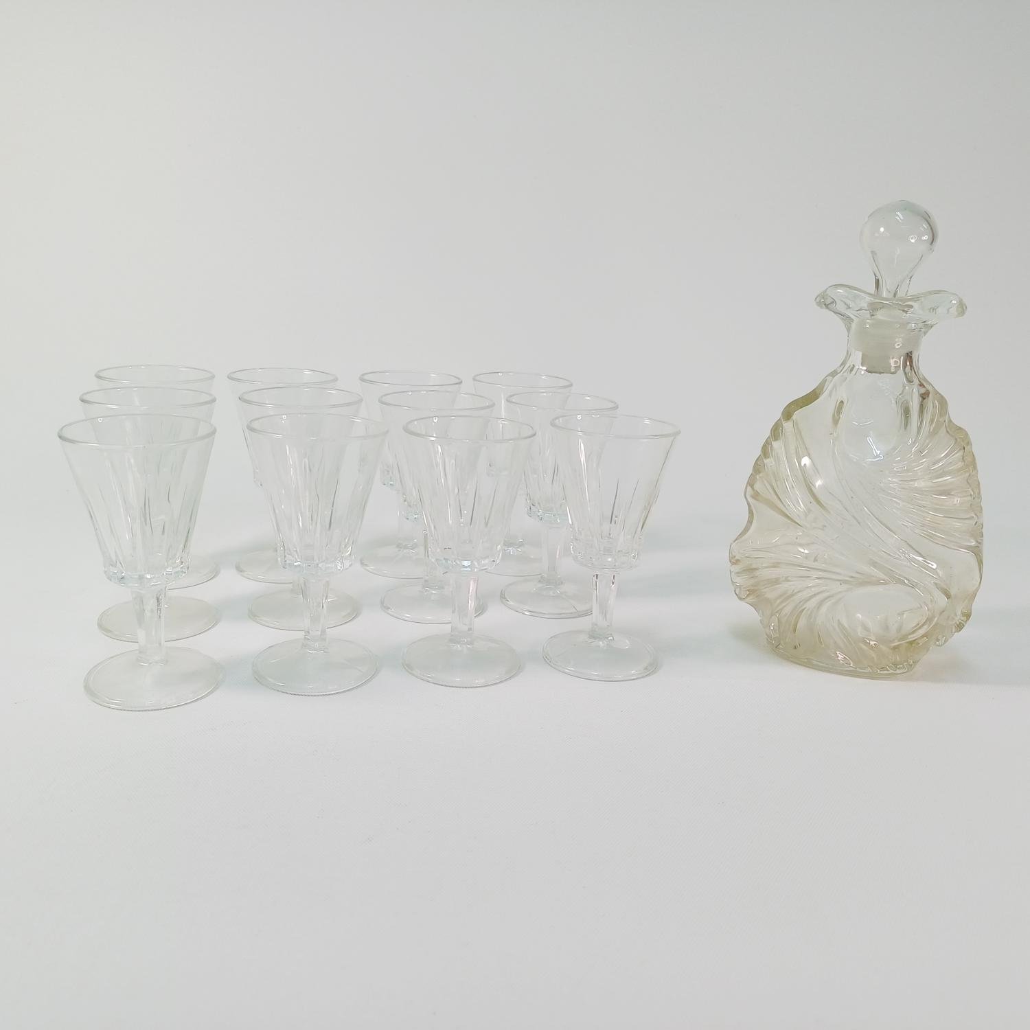 Σετ γυάλινων ποτηριών λικέρ με φιάλη. Αποτελείται από 12 ποτήρια ύψους 10,5 cm και διαμέτρου 5,5cm και μια γυάλινη φιάλη με πώμα ύψους 20 cm. Είναι όλα σε καλή κατάσταση και υπάρχει ο αριθμός 131 στο πώμα της φιάλης.