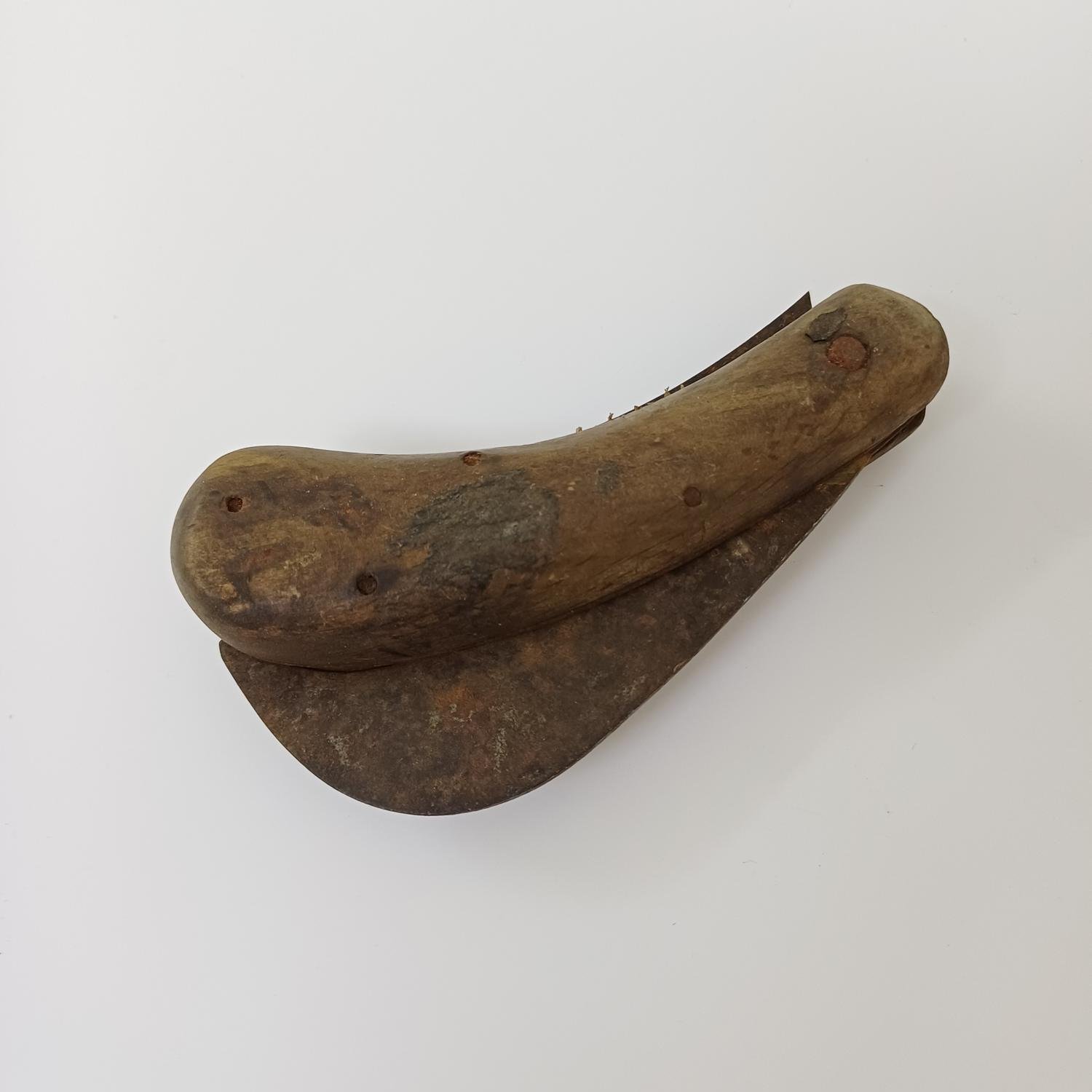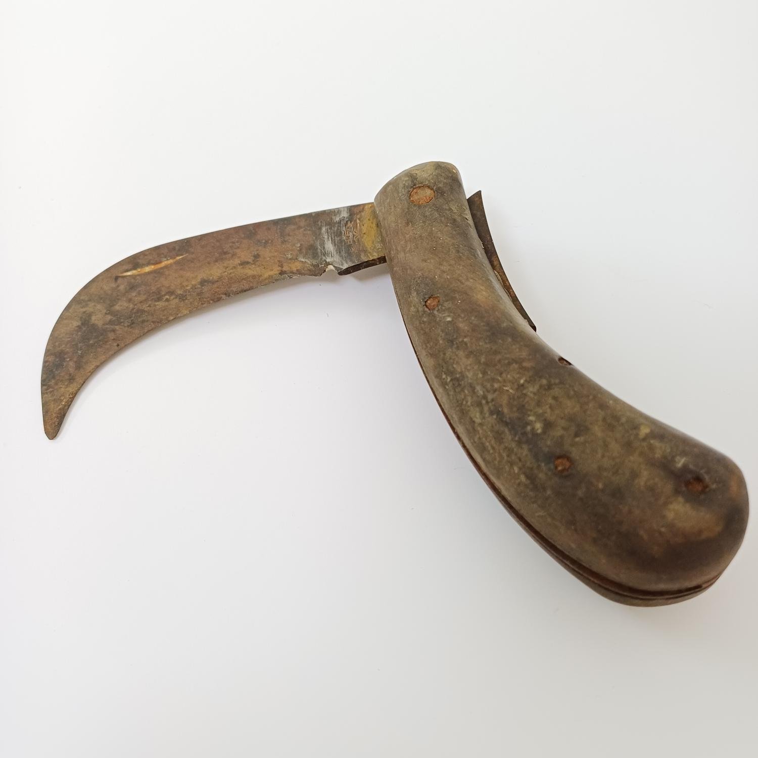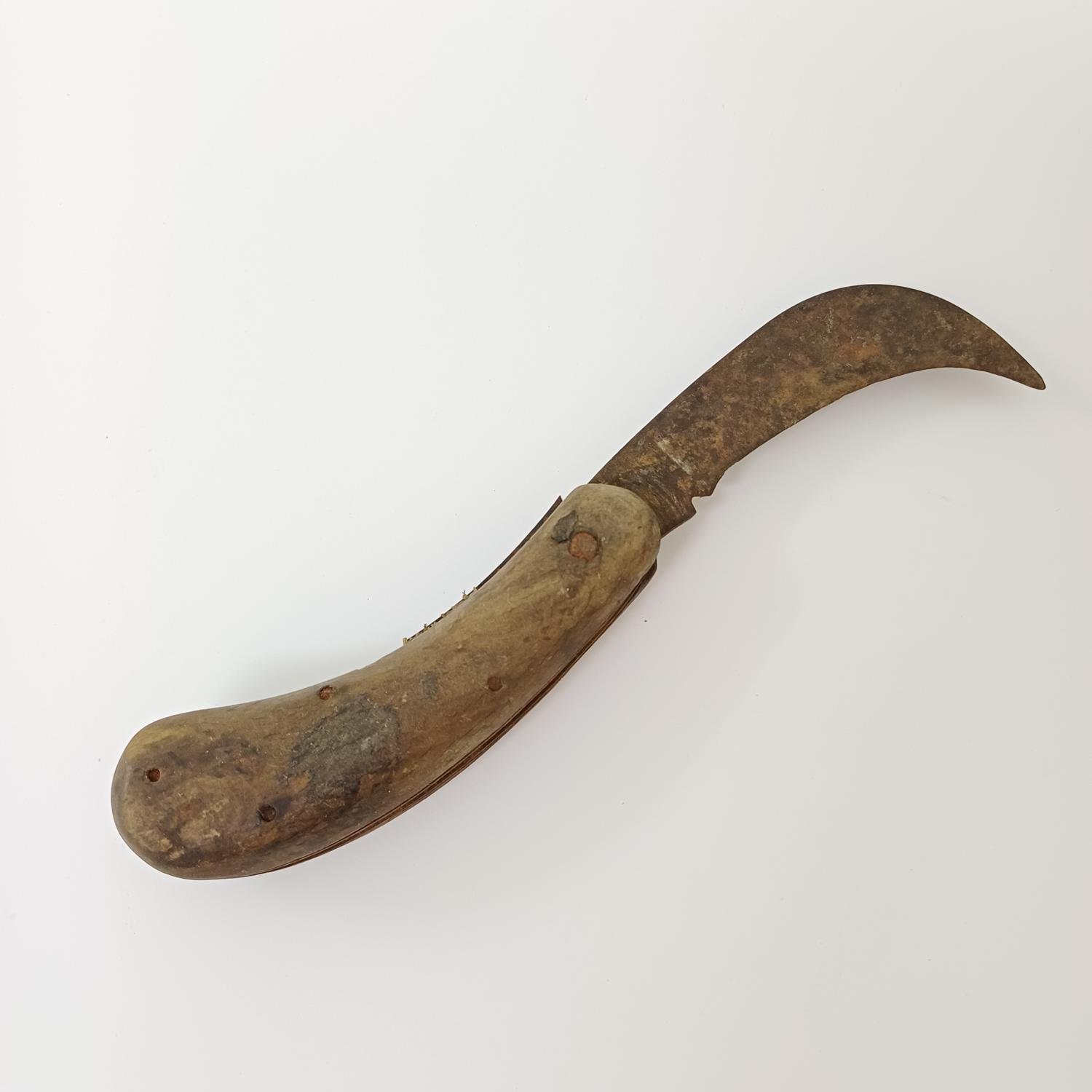 Vintage αναδιπλούμενο μαχαίρι – εργαλείο χειρός με ξύλινη λαβή και μεταλλική λεπίδα. Η αναδιπλούμενη λεπίδα εξασφάλιζε την ασφαλή μεταφορά του εργαλείου. Το μήκους του είναι περίπου 19 cm. Υπάρχει φθορά και στα δυο μέρη του μαχαιριού λόγω χρήσης και παλαιότητας.