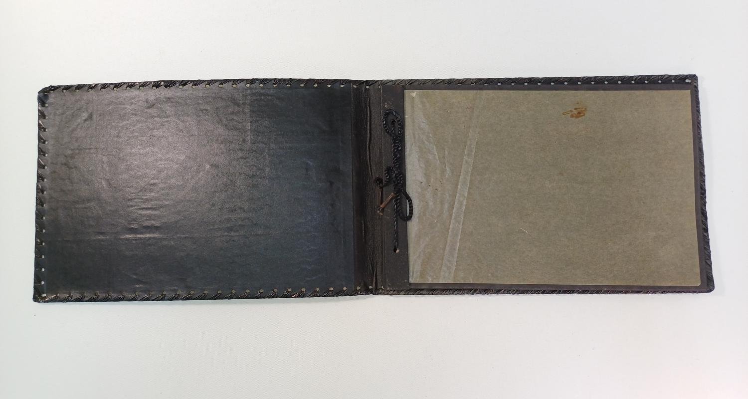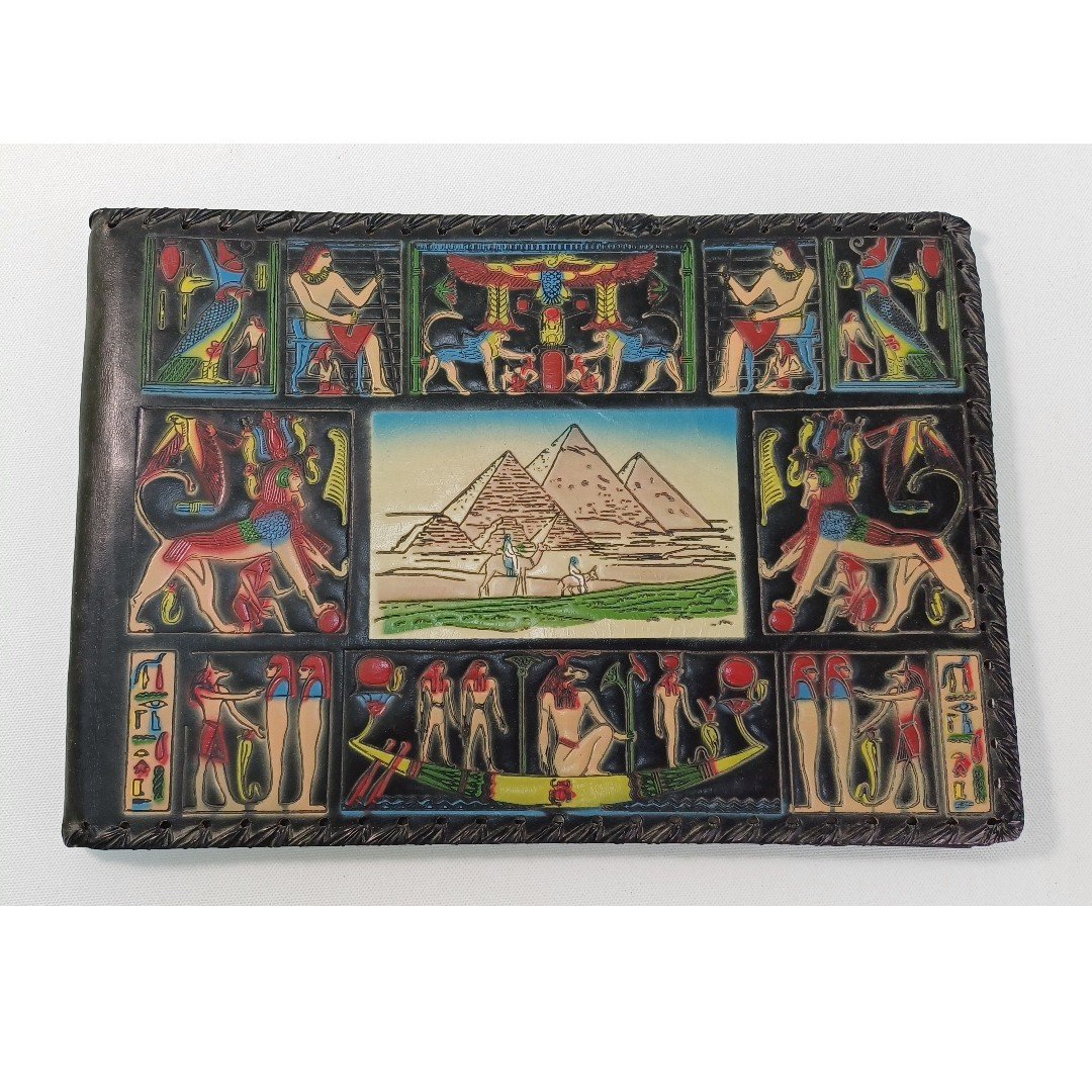 Vintage δερμάτινο άλμπουμ φωτογραφιών, ενθύμιο από την Αίγυπτο. Τα εξώφυλλα είναι διακοσμημένα με περίτεχνα αιγυπτιακά μοτίβα τα οποία είναι ζωγραφισμένα μόνο στο μπροστινό εξώφυλλο. Η κεντρική εικόνα απεικονίζει τις πυραμίδες της Γκίζας, με γύρω έργα τέχνης που περιλαμβάνουν διάφορες αιγυπτιακές θεότητες και ιερογλυφικά. Το άλμπουμ αποτελείται από 18 χαρτονένιες σελίδες με ενδιάμεσο διαφανές προστατευτικό φύλλο και οι διαστάσεις του είναι 29,5 x 20,5 cm. Είναι σε καλή κατάσταση.