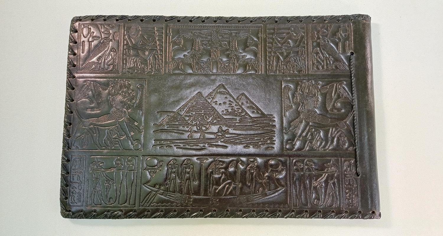 Vintage δερμάτινο άλμπουμ φωτογραφιών, ενθύμιο από την Αίγυπτο, με περίτεχνα αιγυπτιακά μοτίβα στα εξώφυλλα