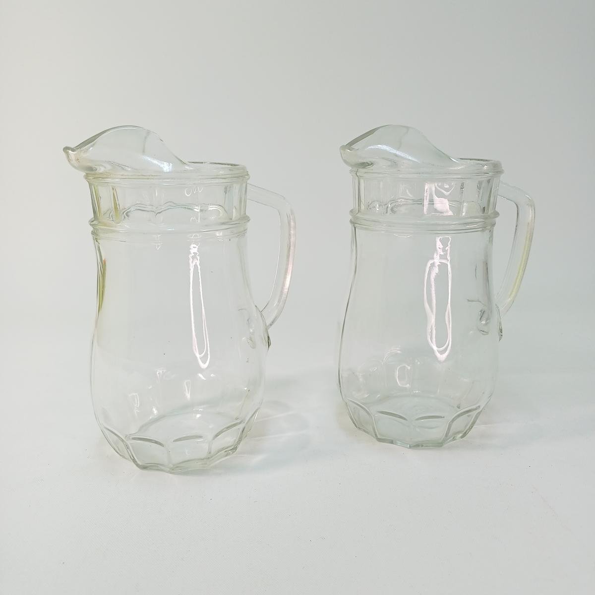 1) 2 γυάλινες κανάτες σε κλασική σχεδίαση, ύψους 22 cm και διαμέτρου 12 cm.