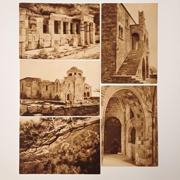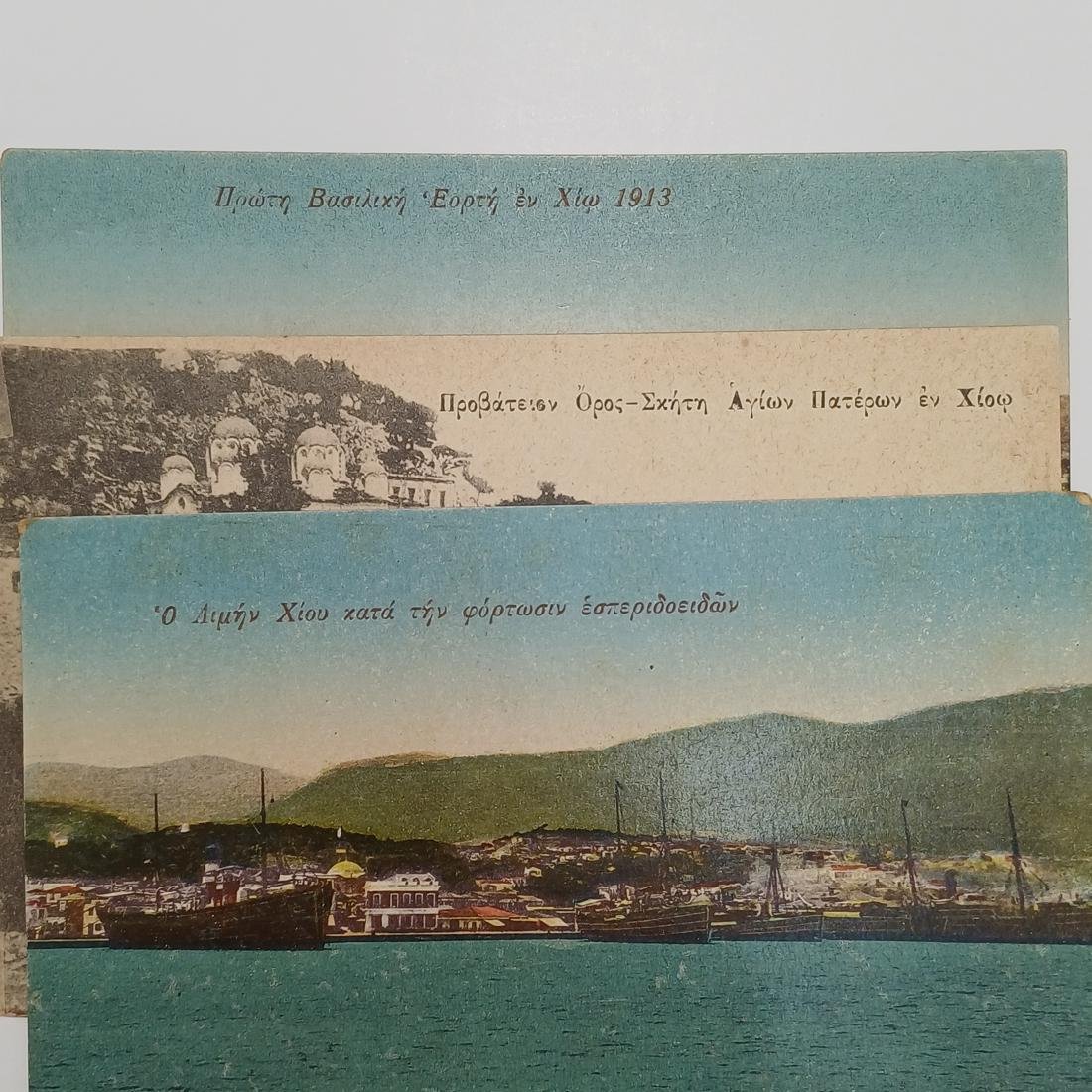 Οι vintage καρτ ποστάλ απεικονίζουν το νησί της Χίου, όπως την πρώτη Βασιλική Εορτή εν Χίω 1913, τον Λιμένα Χίου κατά την φόρτωσιν εσπεριδοειδών και τη Σκήτη των Αγίων Πατέρων στο Προβάτειον Όρος. Χρονολογούνται τον 20ό αιώνα. (μπροστινή όψη)